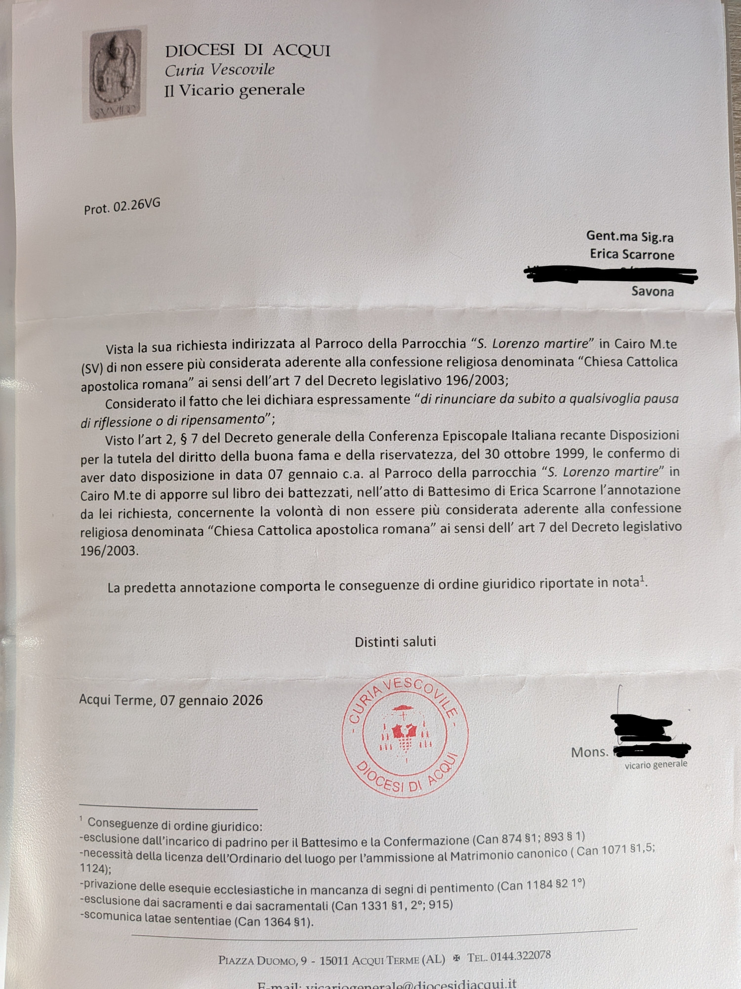 Una persona ha chiesto la rettifica dei dati relativi al proprio battesimo avvenuto a S. Lorenzo Martire - CAIRO MONTENOTTE (SV) il 10/01/2026, dichiarando di non voler più far parte della Chiesa Cattolica.