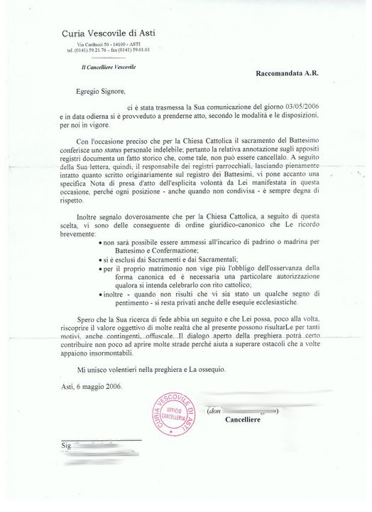 Una persona ha chiesto la rettifica dei dati relativi al proprio battesimo avvenuto a S. Giovanni Bosco - ASTI (AT) il 09/05/2006, dichiarando di non voler più far parte della Chiesa Cattolica.