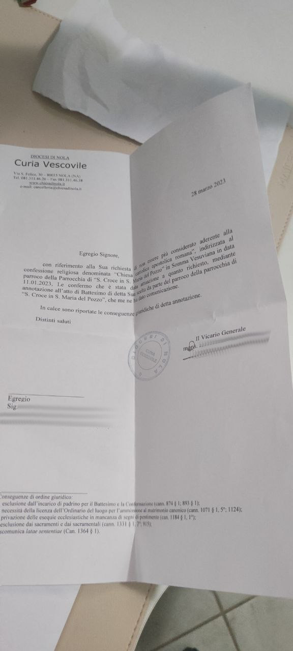 Una persona ha chiesto la rettifica dei dati relativi al proprio battesimo avvenuto a S. Croce in S. Maria del Pozzo - SOMMA VESUVIANA (NA) il 28/03/2023, dichiarando di non voler più far parte della Chiesa Cattolica.
