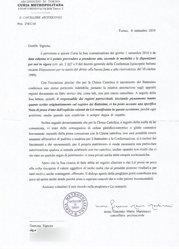 Una persona ha chiesto la rettifica dei dati relativi al proprio battesimo avvenuto a Madonna delle Rose - TORINO (TO) il 08/09/2010, dichiarando di non voler più far parte della Chiesa Cattolica.