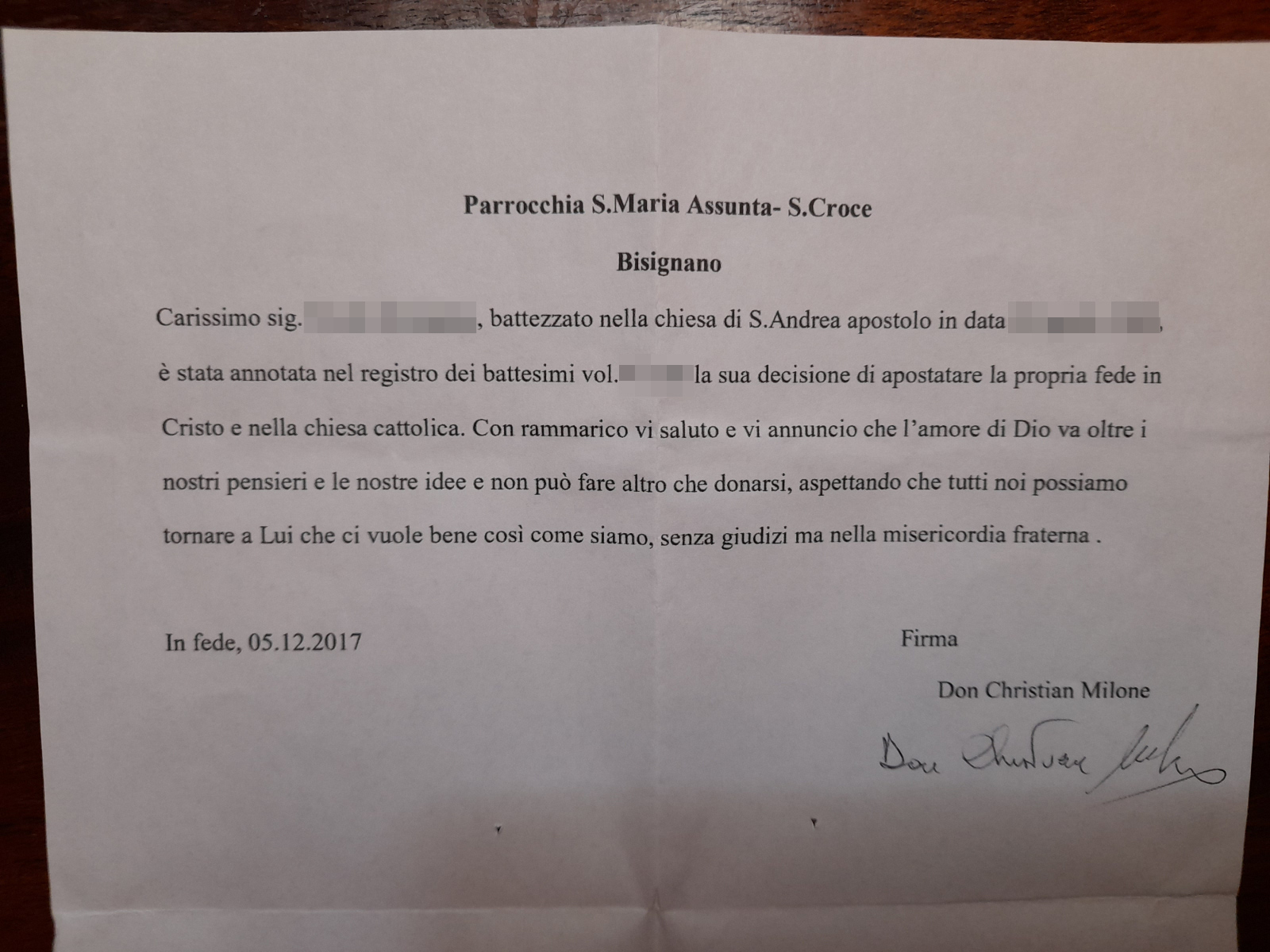 Una persona ha chiesto la rettifica dei dati relativi al proprio battesimo avvenuto a S. Croce - BISIGNANO (CS) il 05/12/2017, dichiarando di non voler più far parte della Chiesa Cattolica.