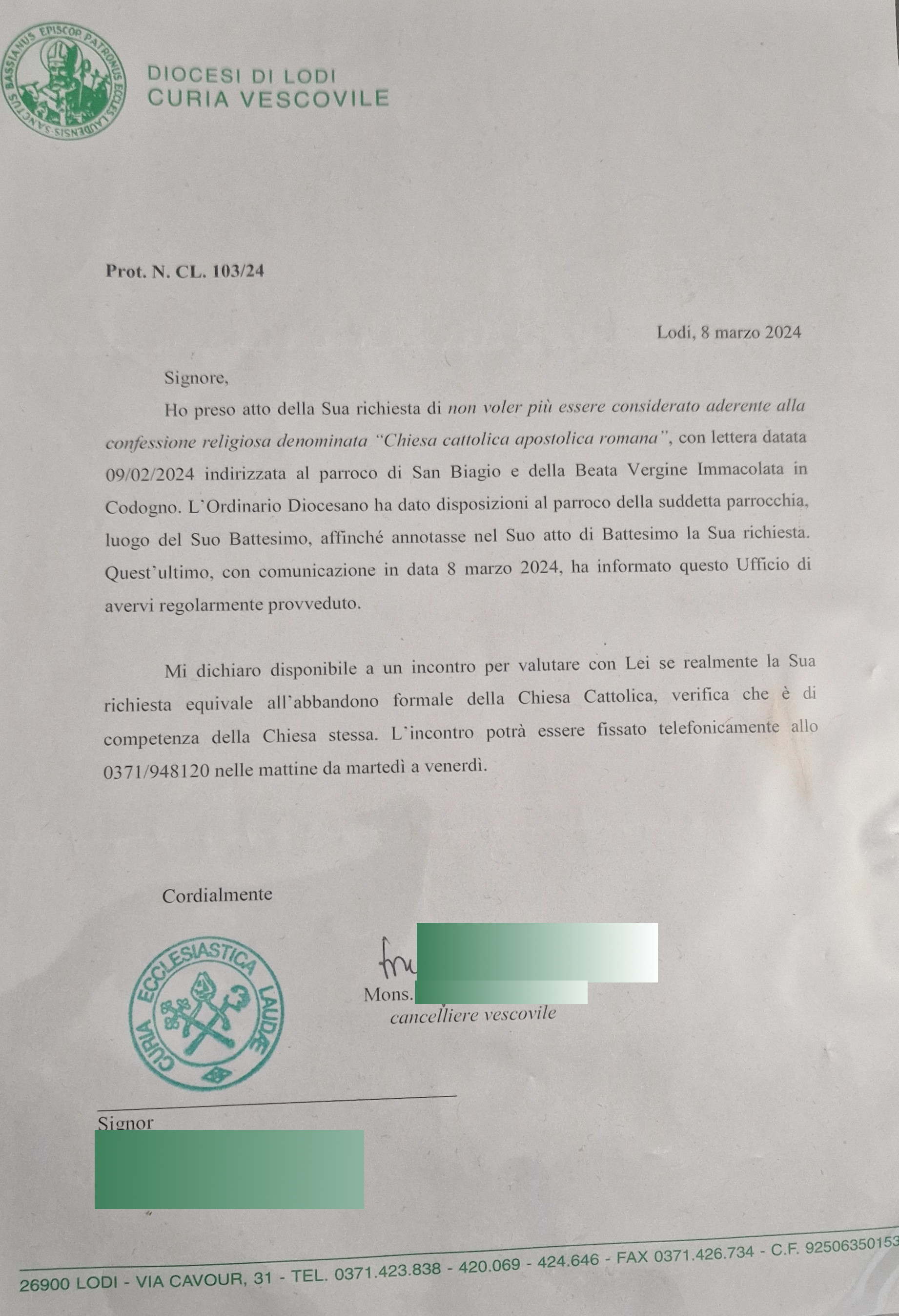 Una persona ha chiesto la rettifica dei dati relativi al proprio battesimo avvenuto a S. Biagio e della Beata Vergine Immacolata - CODOGNO (LO) il 08/03/2024, dichiarando di non voler più far parte della Chiesa Cattolica.