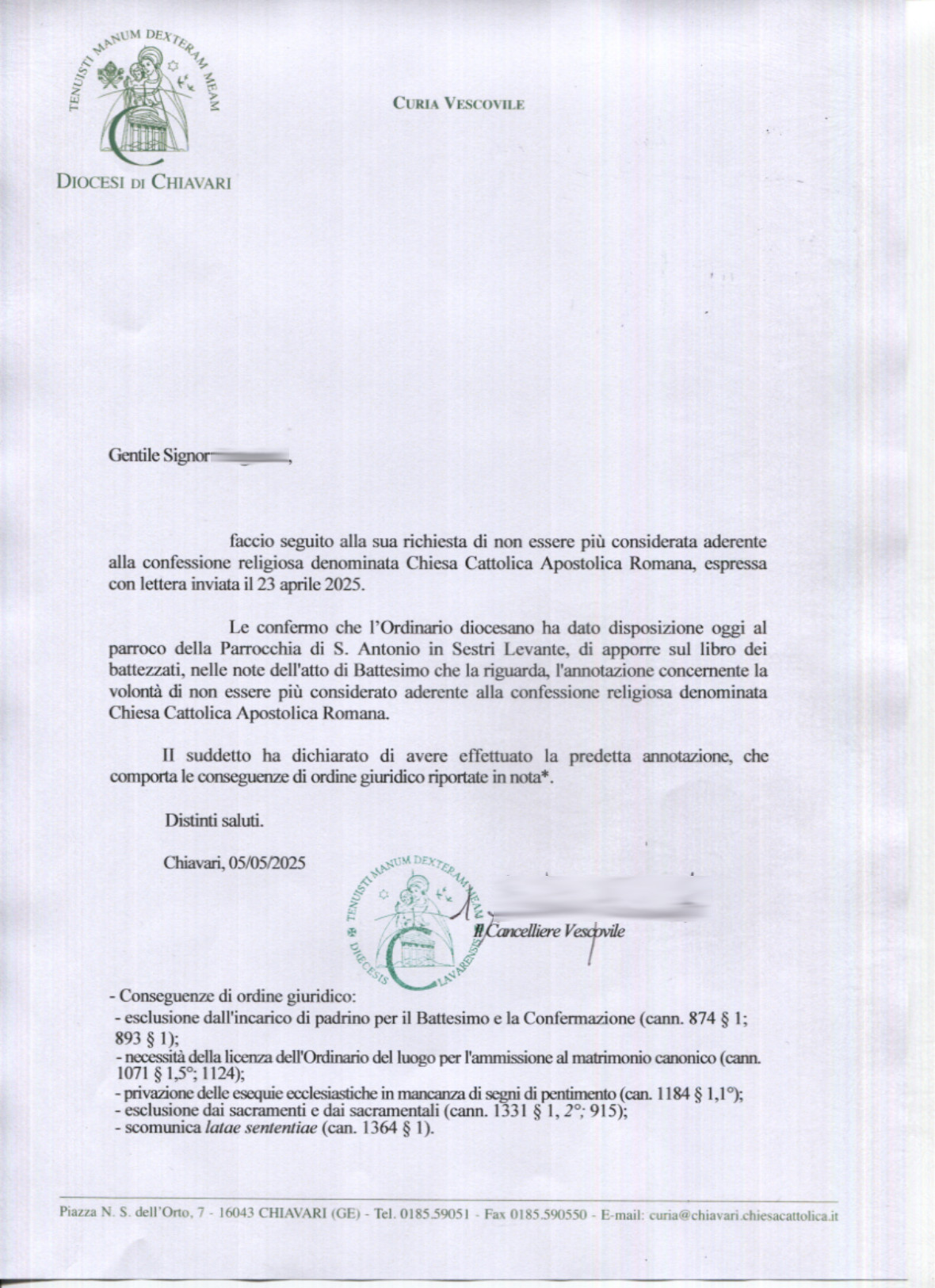 Una persona ha chiesto la rettifica dei dati relativi al proprio battesimo avvenuto a S. Antonio - SESTRI LEVANTE (GE) il 05/05/2025, dichiarando di non voler più far parte della Chiesa Cattolica.