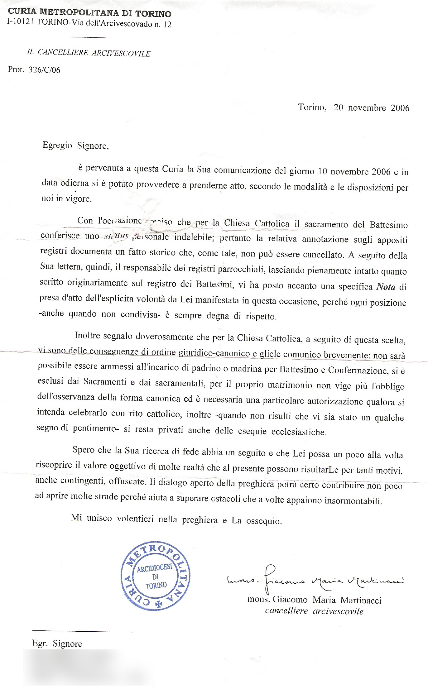 Una persona ha chiesto la rettifica dei dati relativi al proprio battesimo avvenuto a Assunzione di Maria Vergine- Lingotto - TORINO (TO) il 20/11/2006, dichiarando di non voler più far parte della Chiesa Cattolica.