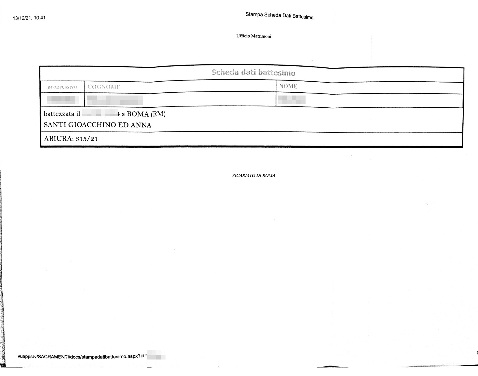 Una persona ha chiesto la rettifica dei dati relativi al proprio battesimo avvenuto a Santi Gioacchino ed Anna - ROMA (RM) il 13/12/2021, dichiarando di non voler più far parte della Chiesa Cattolica.