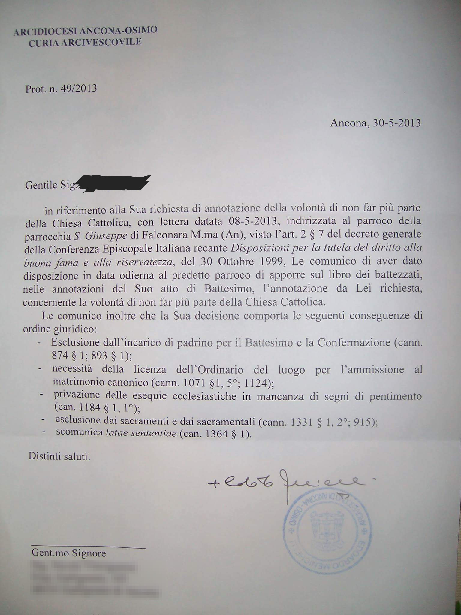 Una persona ha chiesto la rettifica dei dati relativi al proprio battesimo avvenuto a S. Giuseppe - FALCONARA MARITTIMA (AN) il 30/05/2013, dichiarando di non voler più far parte della Chiesa Cattolica.
