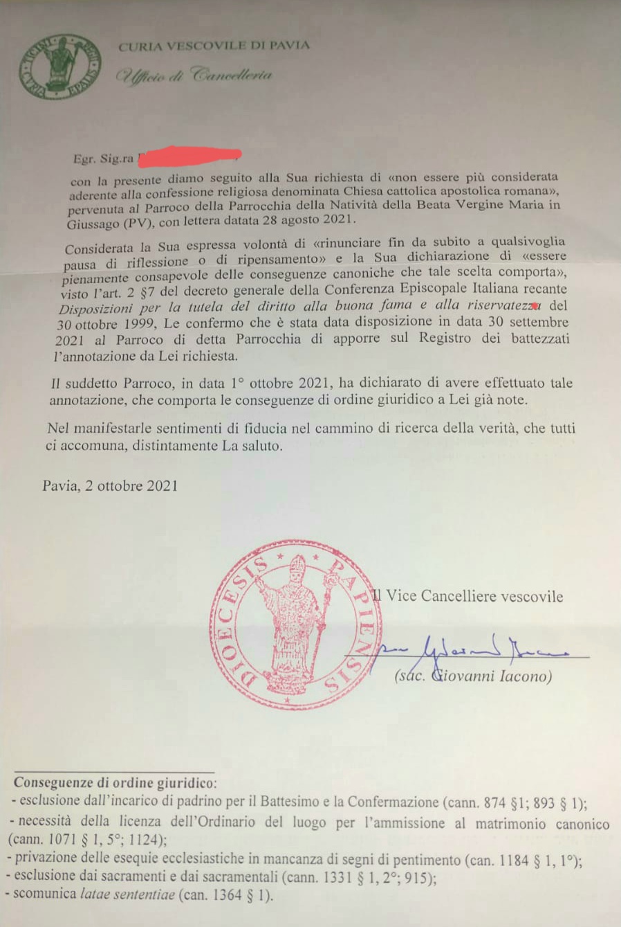 Una persona ha chiesto la rettifica dei dati relativi al proprio battesimo avvenuto a Natività di Maria Vergine - GIUSSAGO (PV) il 06/10/2021, dichiarando di non voler più far parte della Chiesa Cattolica.