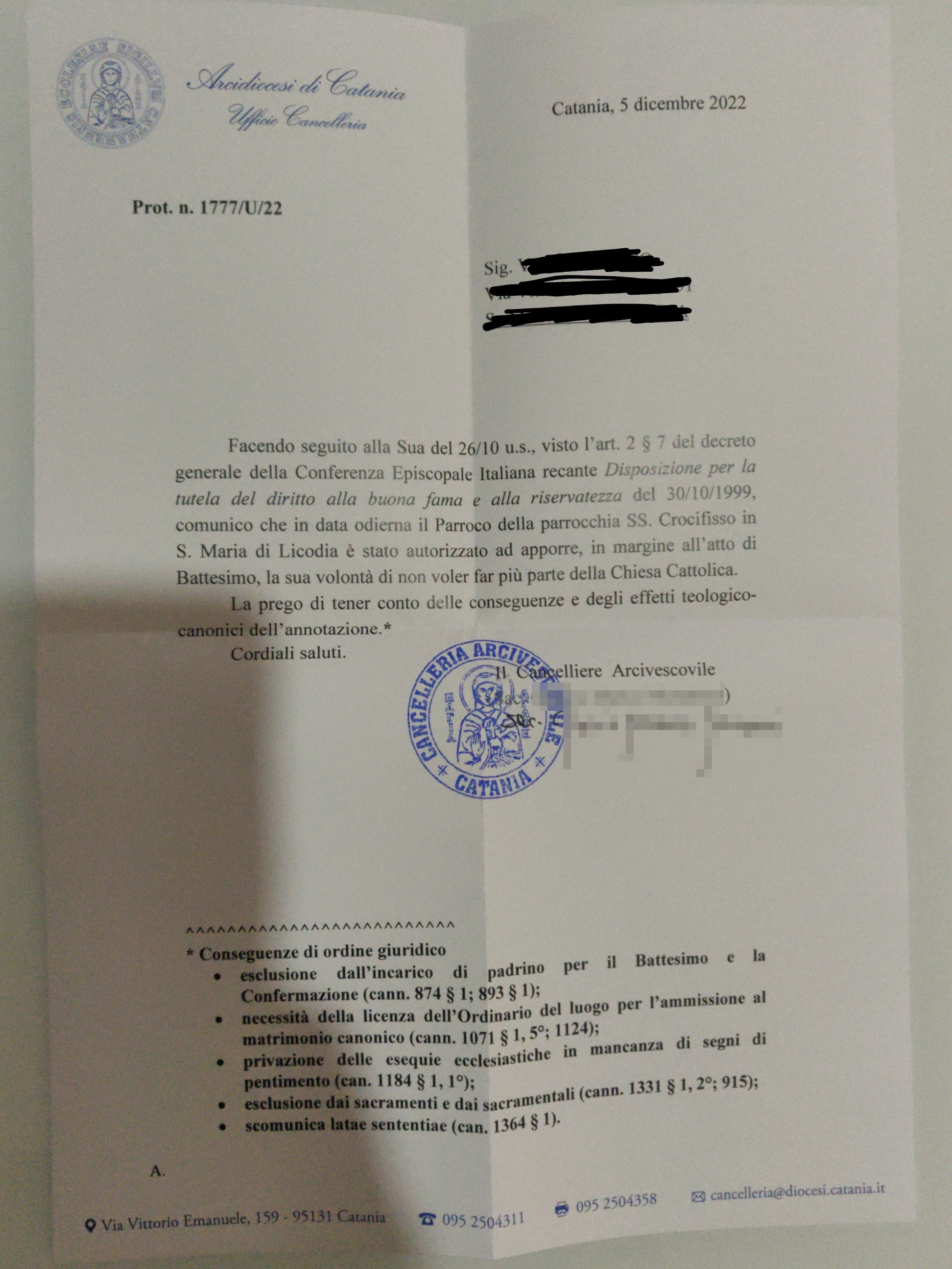 Una persona ha chiesto la rettifica dei dati relativi al proprio battesimo avvenuto a Ss. Crocifisso - SANTA MARIA DI LICODIA (CT) il 05/12/2022, dichiarando di non voler più far parte della Chiesa Cattolica.