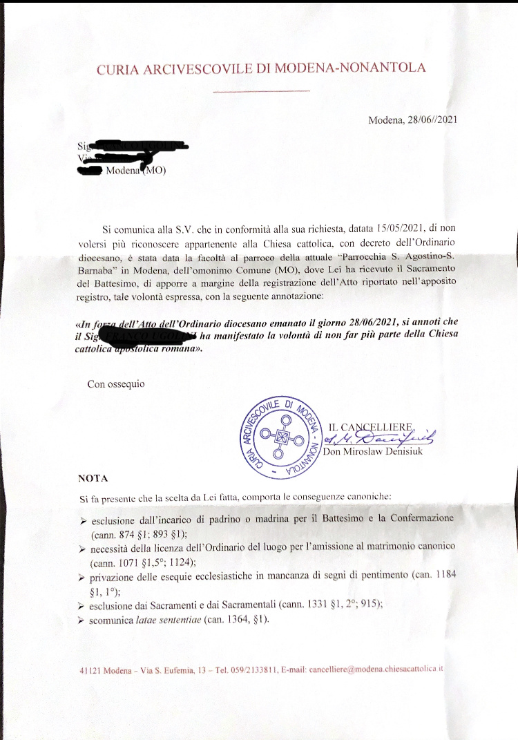 Una persona ha chiesto la rettifica dei dati relativi al proprio battesimo avvenuto a S. Agostino - S. Barnaba - MODENA (MO) il 28/06/2021, dichiarando di non voler più far parte della Chiesa Cattolica.