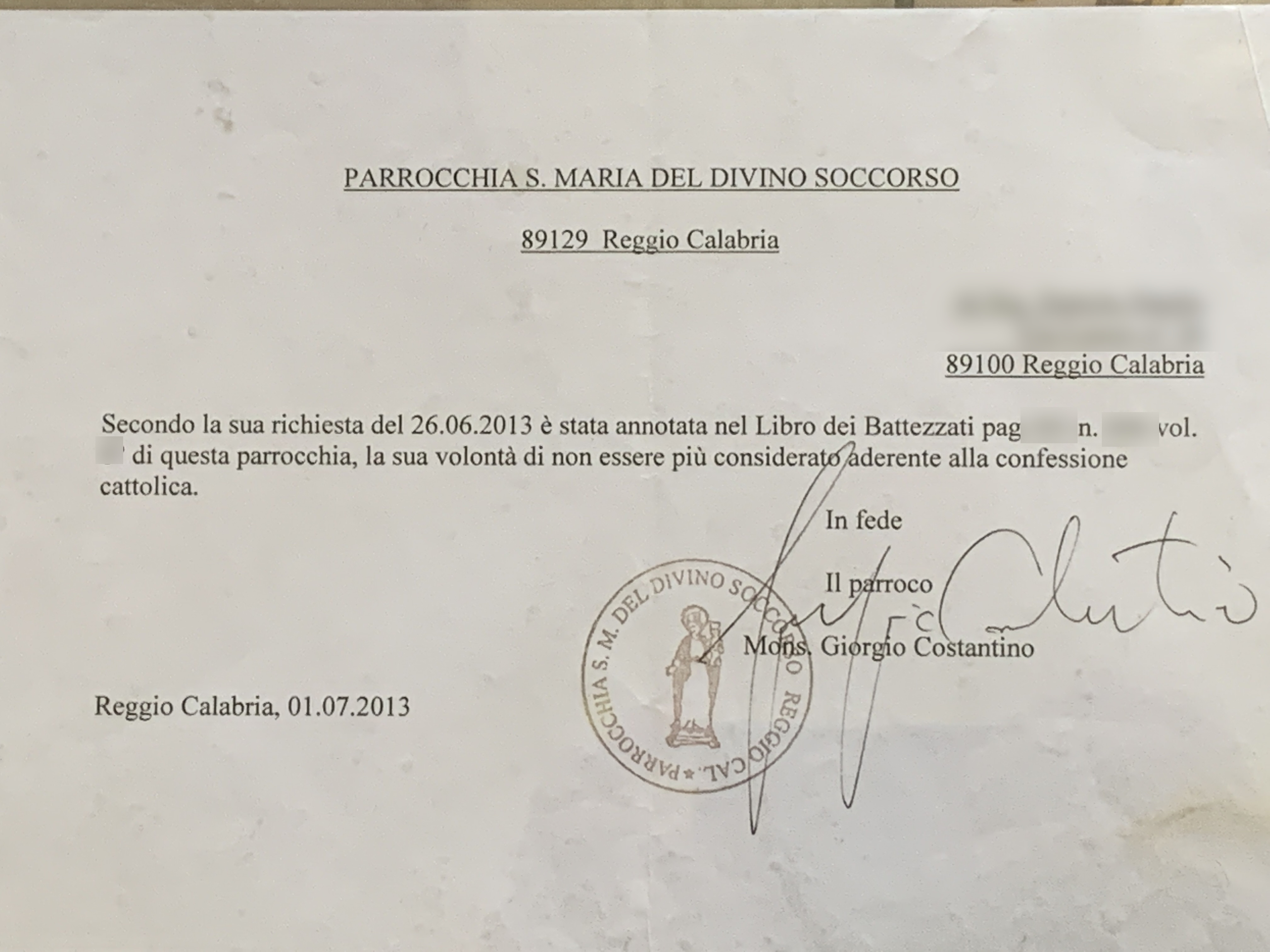 Una persona ha chiesto la rettifica dei dati relativi al proprio battesimo avvenuto a S. Maria del Divino Soccorso - REGGIO DI CALABRIA (RC) il 01/07/2013, dichiarando di non voler più far parte della Chiesa Cattolica.