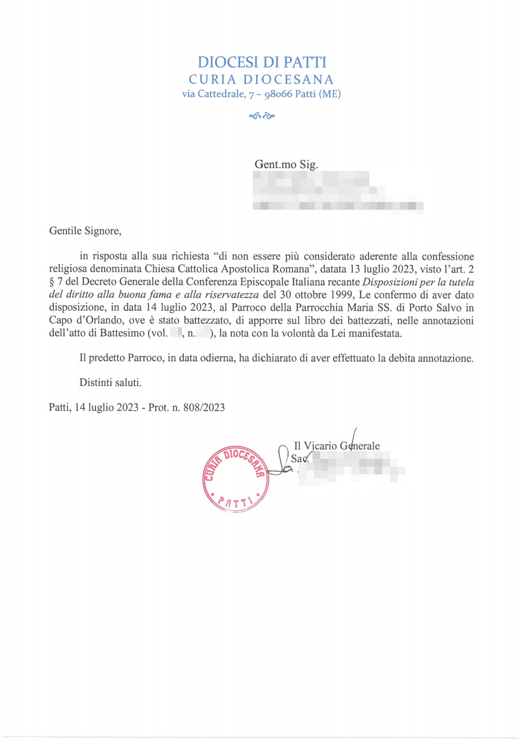 Una persona ha chiesto la rettifica dei dati relativi al proprio battesimo avvenuto a Maria Ss. di Porto Salvo - CAPO D'ORLANDO (ME) il 14/07/2023, dichiarando di non voler più far parte della Chiesa Cattolica.