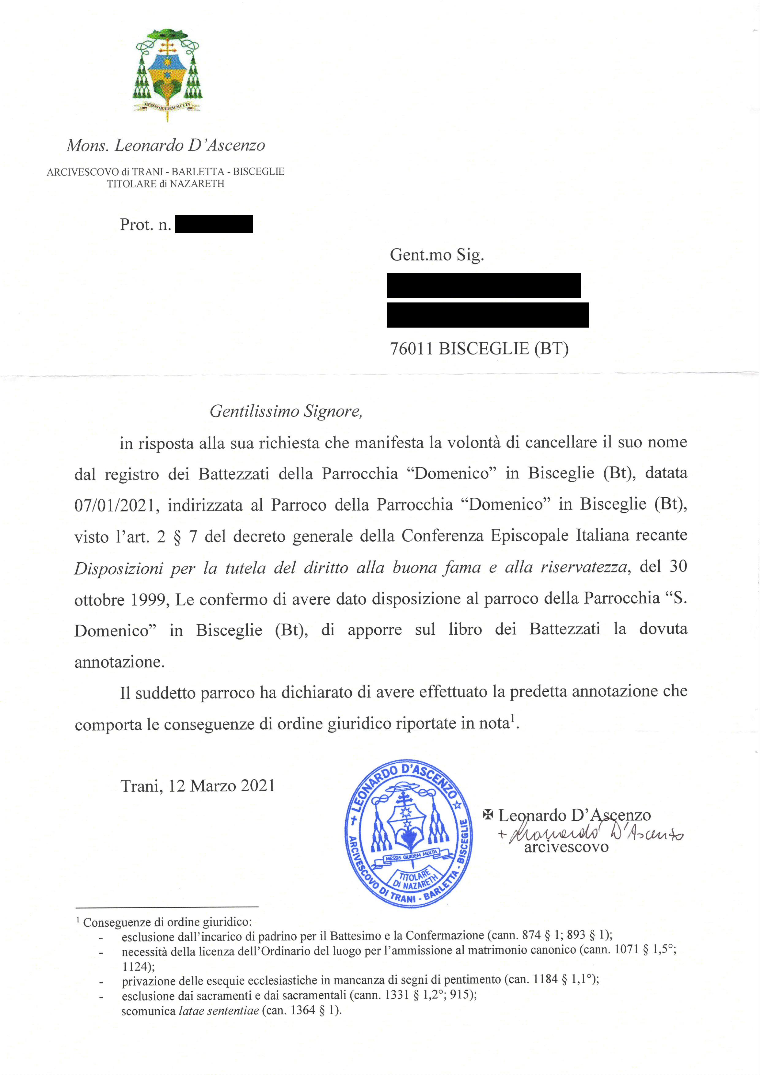 Una persona ha chiesto la rettifica dei dati relativi al proprio battesimo avvenuto a S. Domenico - BISCEGLIE (BT) il 12/03/2021, dichiarando di non voler più far parte della Chiesa Cattolica.