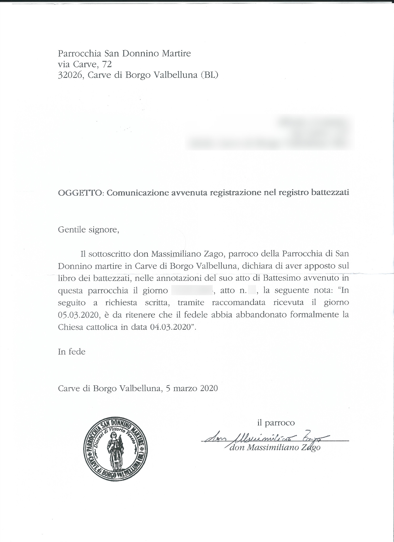 Una persona ha chiesto la rettifica dei dati relativi al proprio battesimo avvenuto a S. Donnino Martire - BORGO VALBELLUNA (BL) il 04/03/2020, dichiarando di non voler più far parte della Chiesa Cattolica.