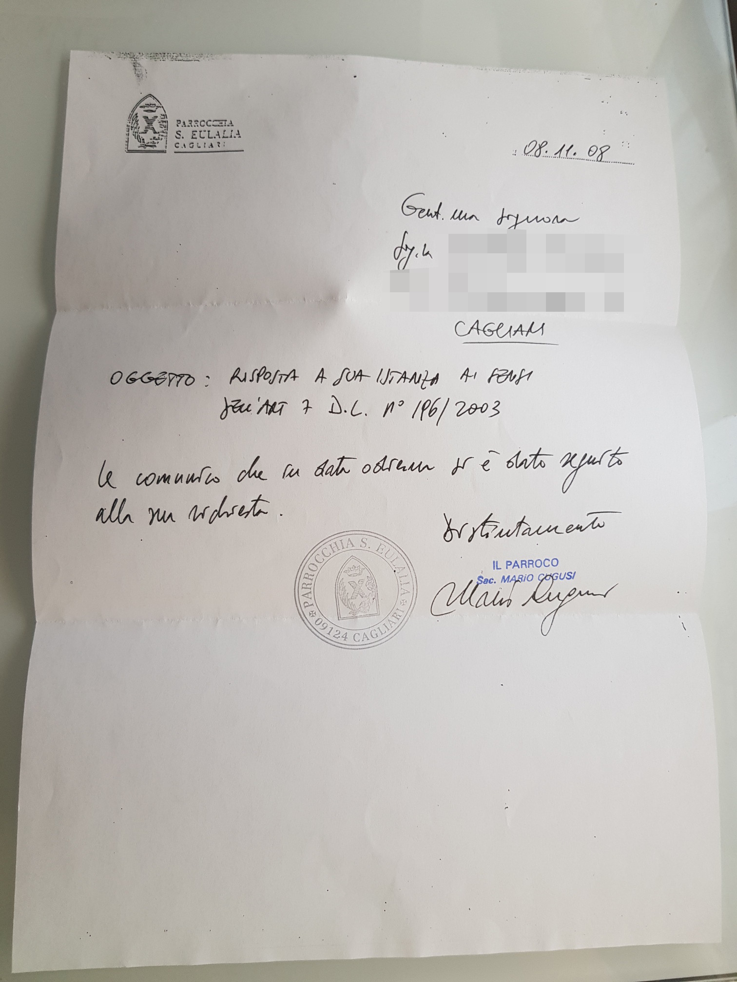 Una persona ha chiesto la rettifica dei dati relativi al proprio battesimo avvenuto a S. Eulalia - CAGLIARI (CA) il 10/11/2008, dichiarando di non voler più far parte della Chiesa Cattolica.