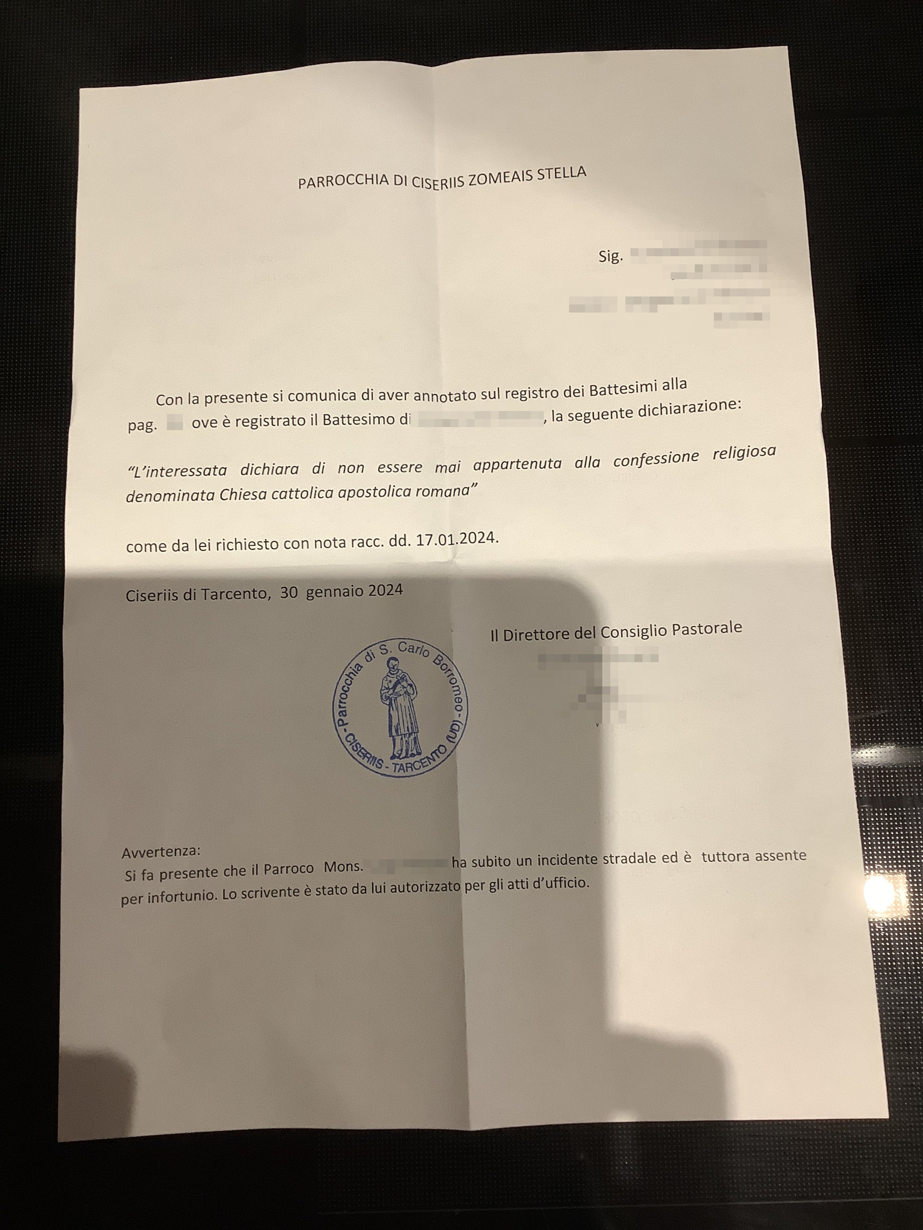 Una persona ha chiesto la rettifica dei dati relativi al proprio battesimo avvenuto a San Carlo Borromeo - TARCENTO (UD) il 30/01/2024, dichiarando di non voler più far parte della Chiesa Cattolica.