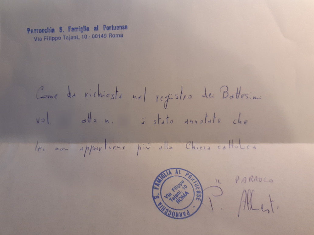 Una persona ha chiesto la rettifica dei dati relativi al proprio battesimo avvenuto a S. Famiglia a Via Portuense - ROMA (RM) il 23/04/2006, dichiarando di non voler più far parte della Chiesa Cattolica.