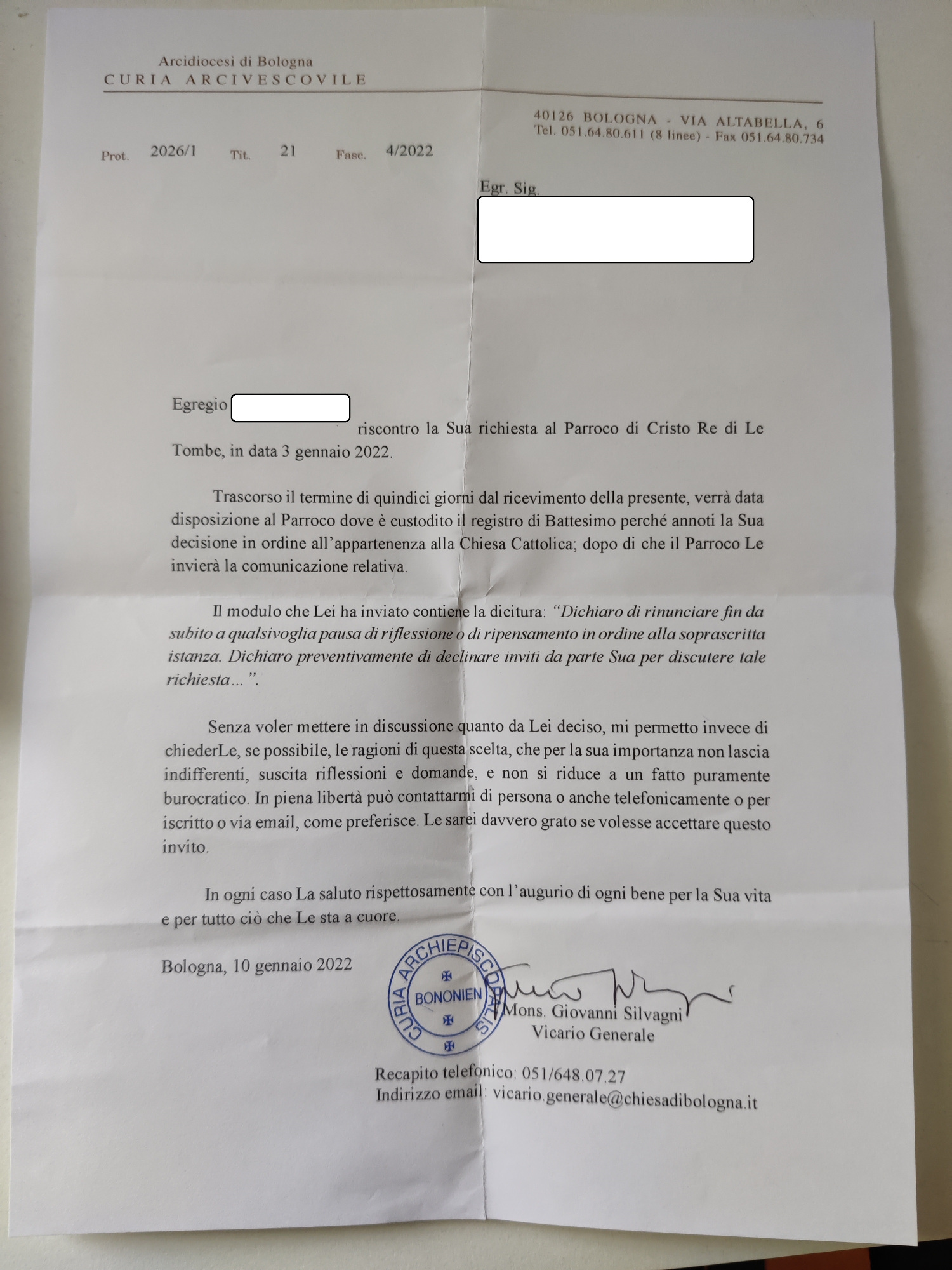 Una persona ha chiesto la rettifica dei dati relativi al proprio battesimo avvenuto a Cristo Re di Le Tombe - ZOLA PREDOSA (BO) il 10/01/2022, dichiarando di non voler più far parte della Chiesa Cattolica.