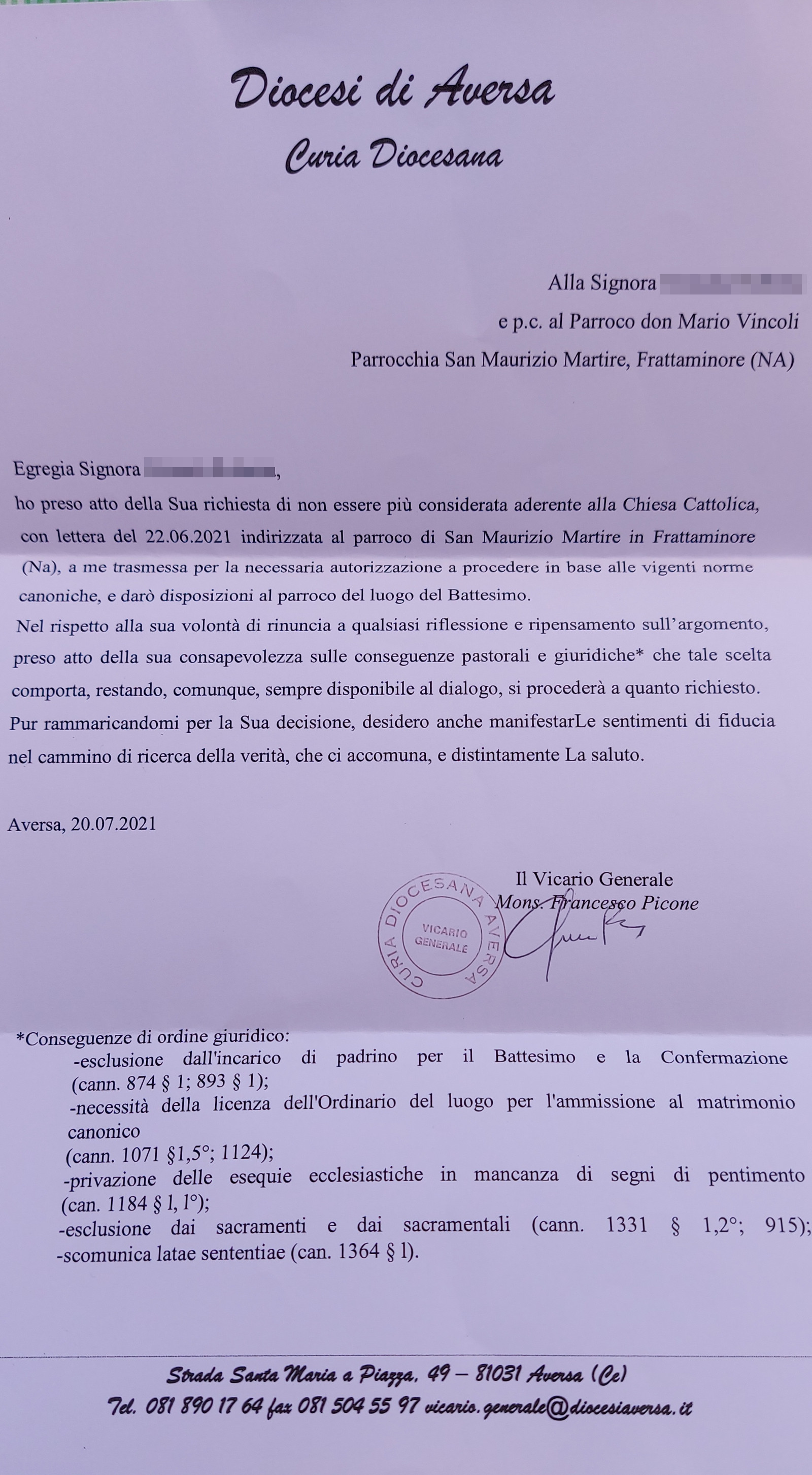 Una persona ha chiesto la rettifica dei dati relativi al proprio battesimo avvenuto a S. Maurizio - FRATTAMINORE (NA) il 24/07/2021, dichiarando di non voler più far parte della Chiesa Cattolica.