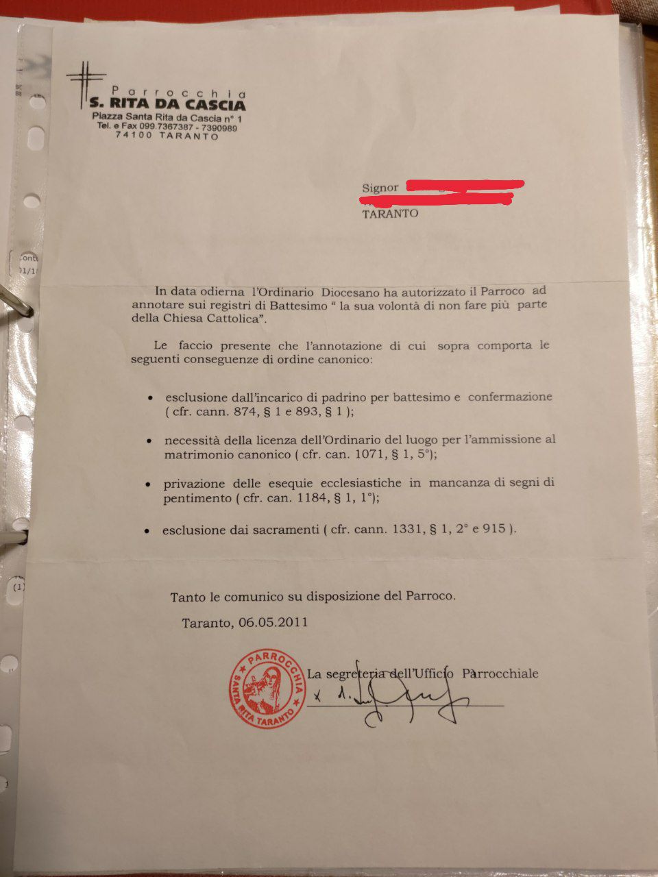 Una persona ha chiesto la rettifica dei dati relativi al proprio battesimo avvenuto a S. Rita - TARANTO (TA) il 06/05/2011, dichiarando di non voler più far parte della Chiesa Cattolica.