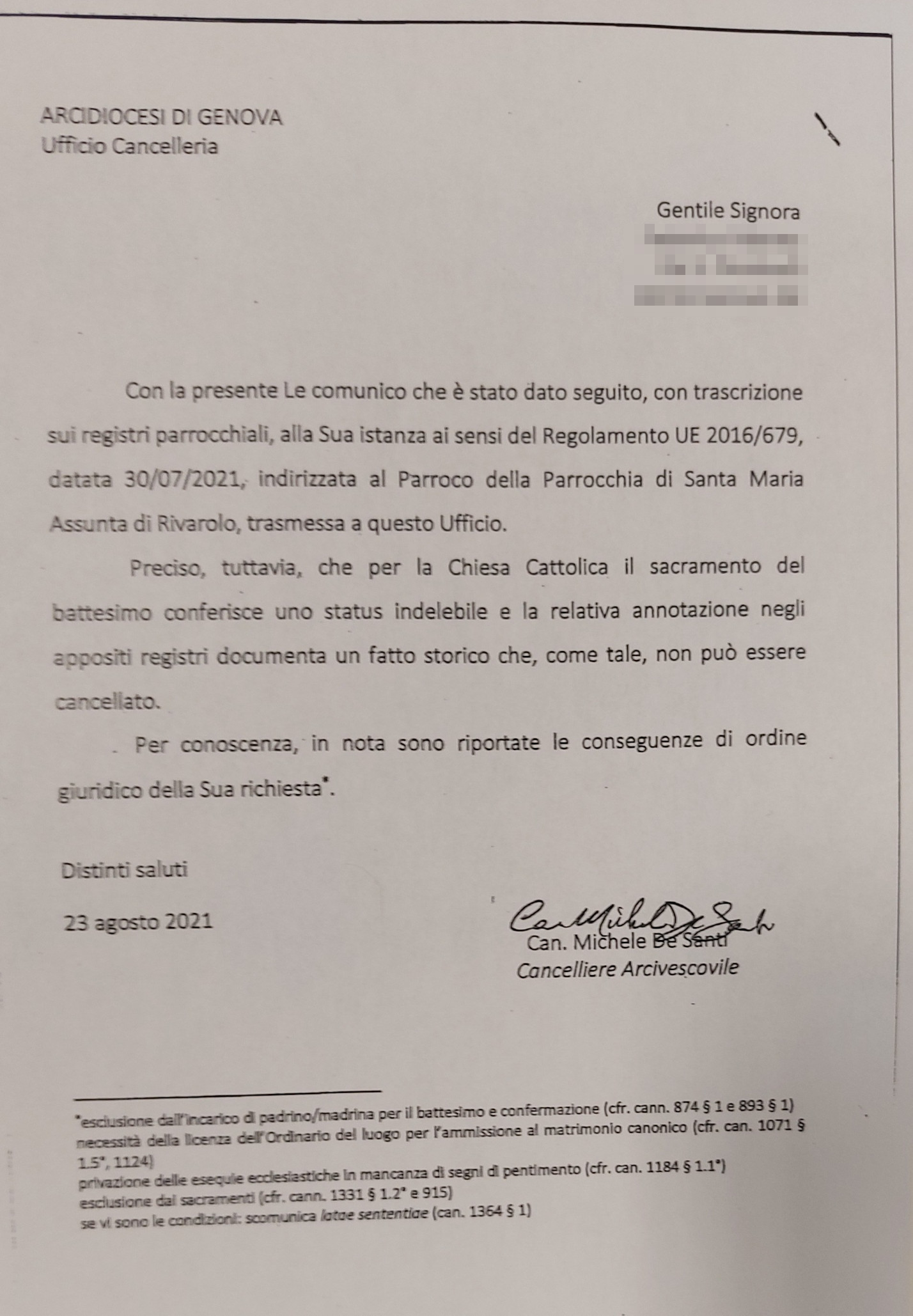 Una persona ha chiesto la rettifica dei dati relativi al proprio battesimo avvenuto a S. Maria Assunta - GENOVA (GE) il 23/08/2021, dichiarando di non voler più far parte della Chiesa Cattolica.