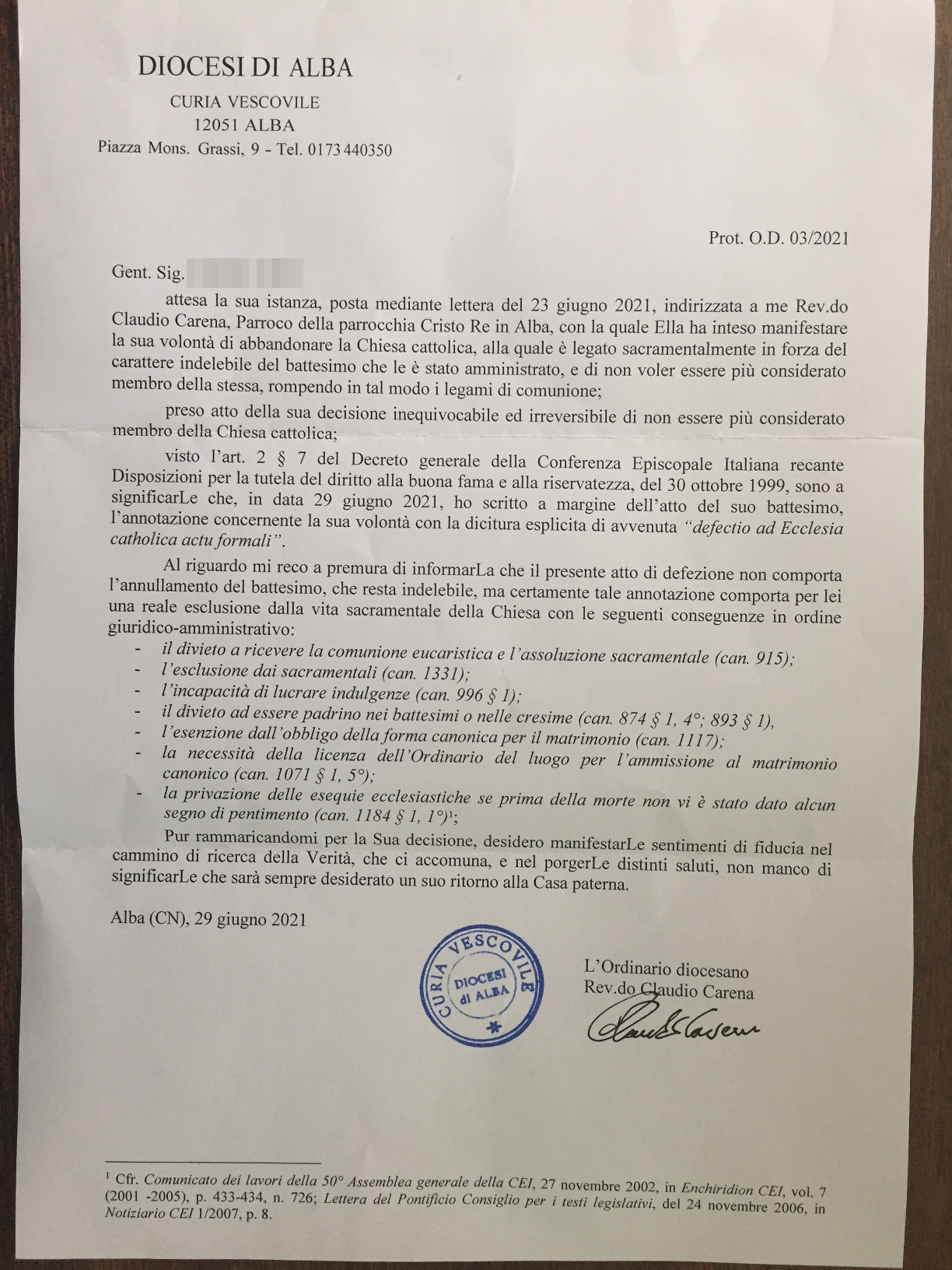 Una persona ha chiesto la rettifica dei dati relativi al proprio battesimo avvenuto a Cristo Re - ALBA (CN) il 29/06/2021, dichiarando di non voler più far parte della Chiesa Cattolica.