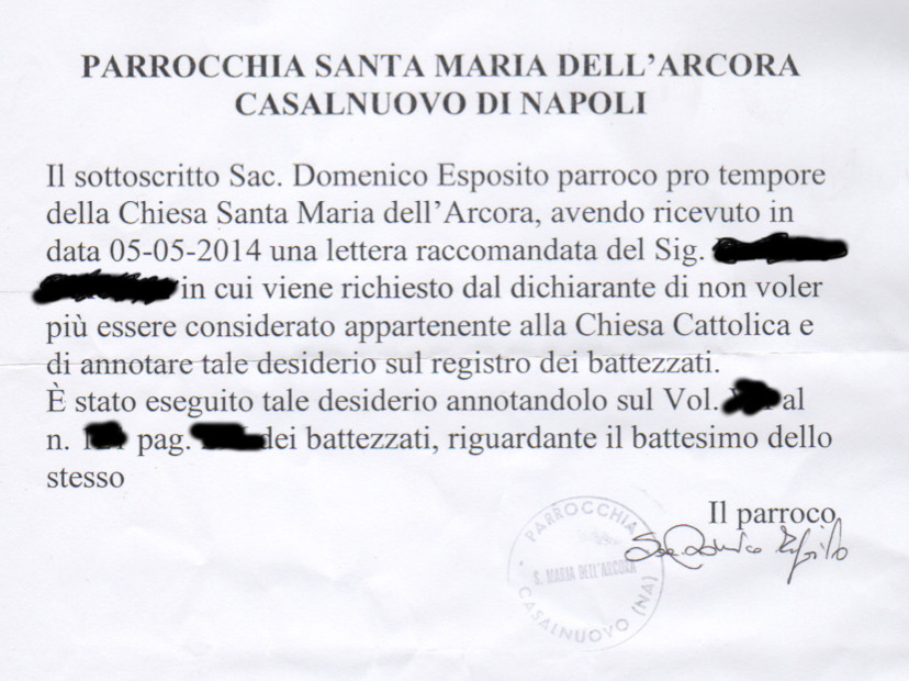 Una persona ha chiesto la rettifica dei dati relativi al proprio battesimo avvenuto a S. Maria dell'arcora - CASALNUOVO DI NAPOLI (NA) il 25/05/2014, dichiarando di non voler più far parte della Chiesa Cattolica.
