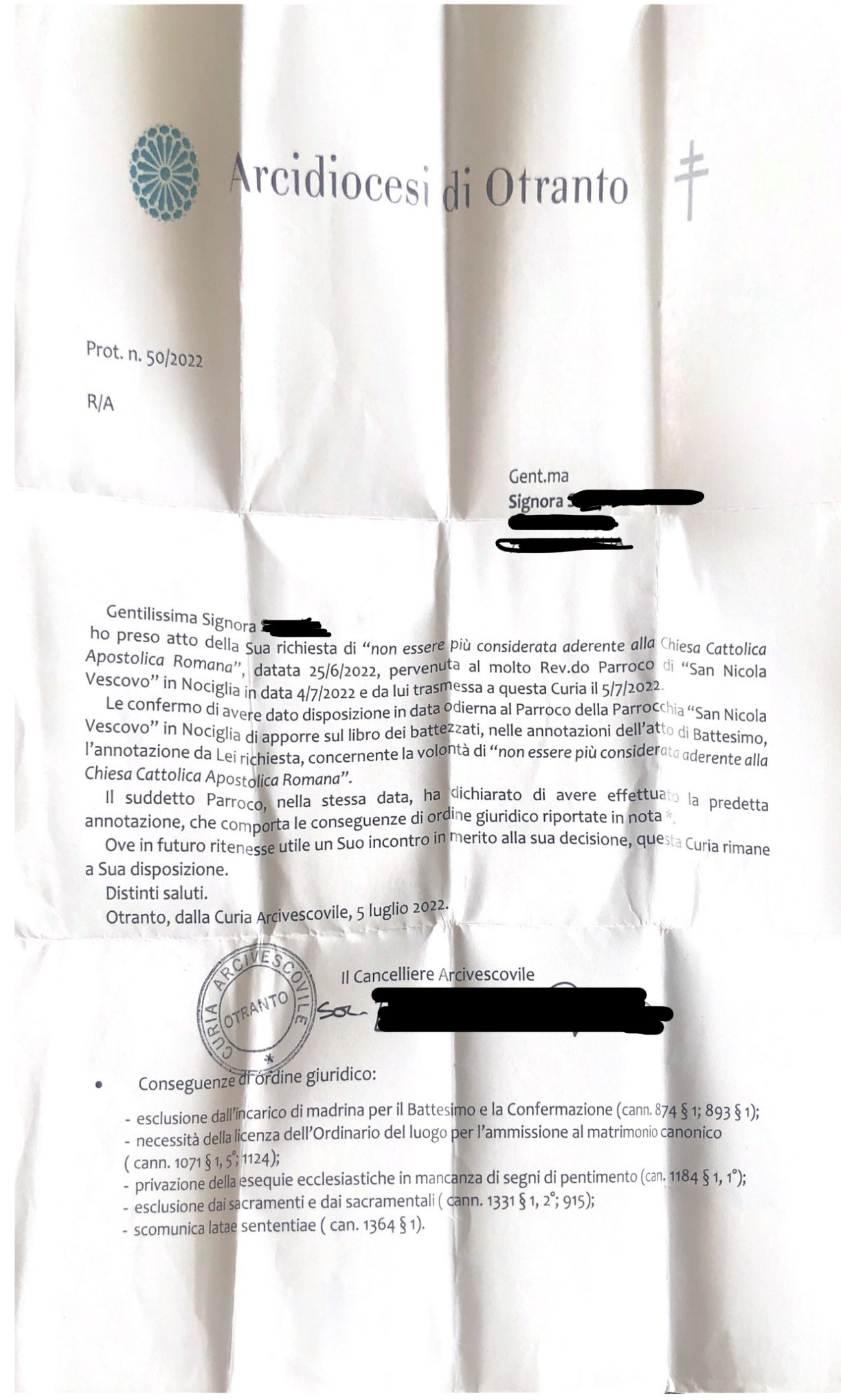 Una persona ha chiesto la rettifica dei dati relativi al proprio battesimo avvenuto a S. Nicola Vescovo - NOCIGLIA (LE) il 04/07/2022, dichiarando di non voler più far parte della Chiesa Cattolica.