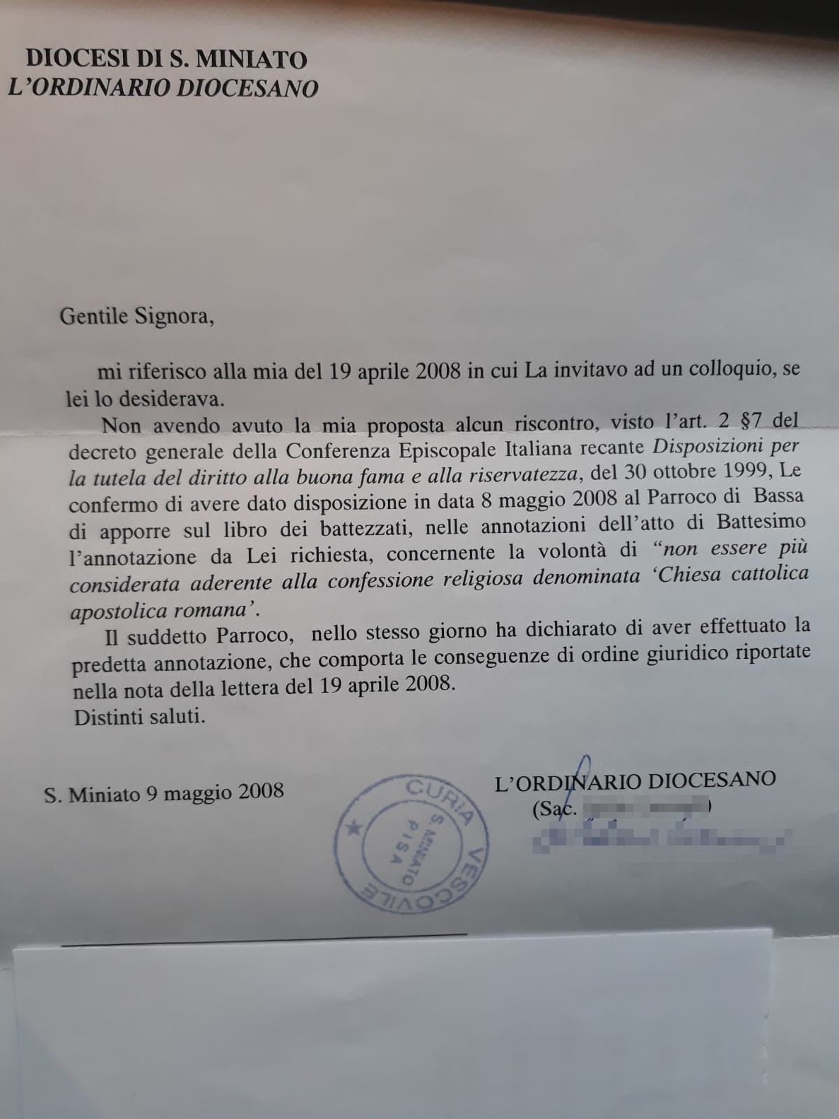 Una persona ha chiesto la rettifica dei dati relativi al proprio battesimo avvenuto a S. Maria Assunta - CERRETO GUIDI (FI) il 19/04/2008, dichiarando di non voler più far parte della Chiesa Cattolica.