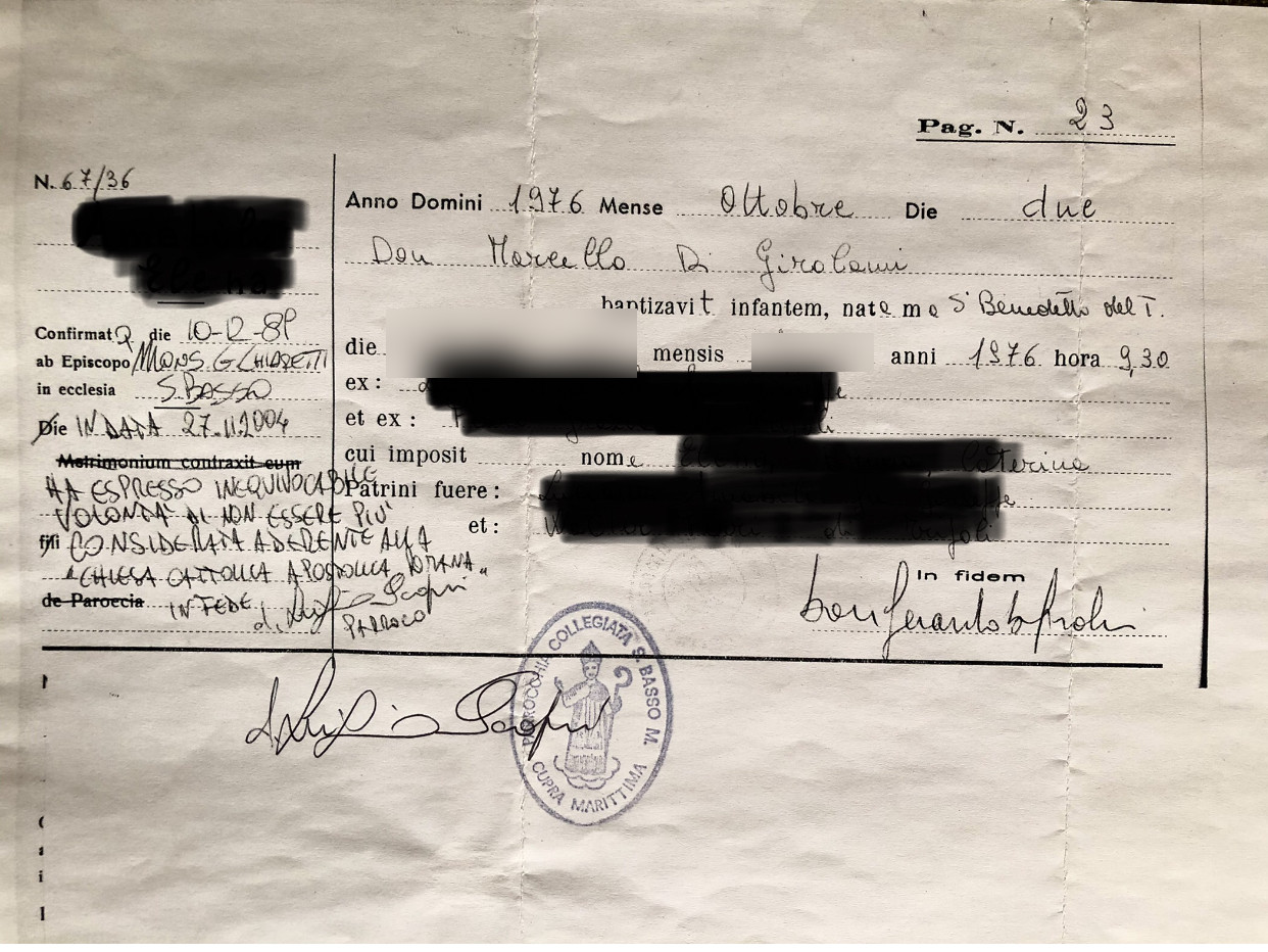 Una persona ha chiesto la rettifica dei dati relativi al proprio battesimo avvenuto a S. Basso - CUPRA MARITTIMA (AP) il 27/11/2004, dichiarando di non voler più far parte della Chiesa Cattolica.