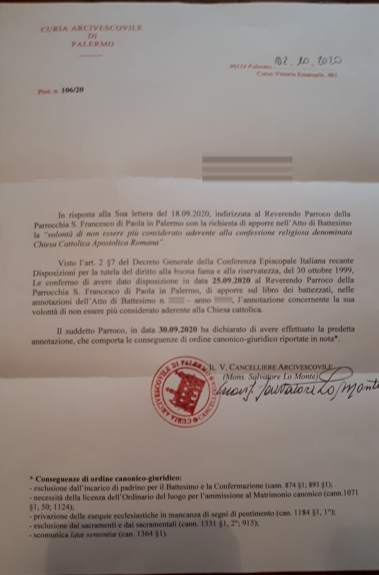 Una persona ha chiesto la rettifica dei dati relativi al proprio battesimo avvenuto a S. Francesco di Paola - PALERMO (PA) il 02/10/2020, dichiarando di non voler più far parte della Chiesa Cattolica.