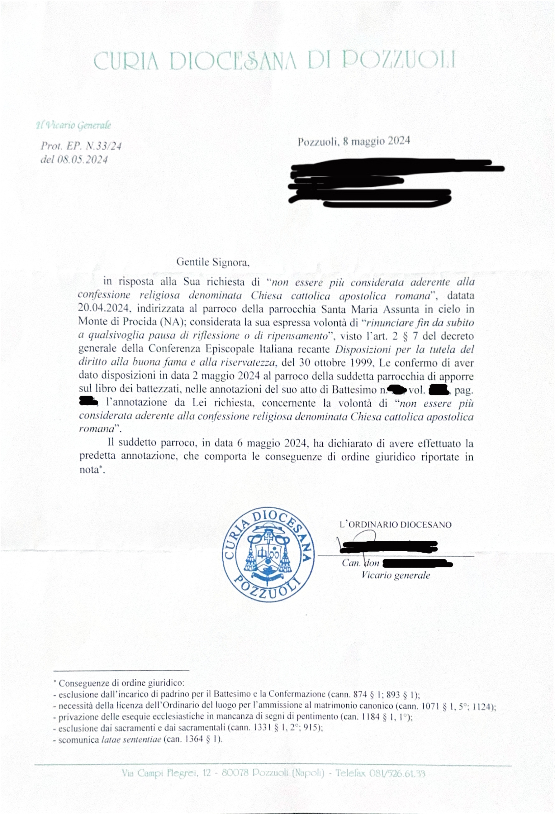 Una persona ha chiesto la rettifica dei dati relativi al proprio battesimo avvenuto a S. Maria Assunta in Cielo - MONTE DI PROCIDA (NA) il 07/05/2024, dichiarando di non voler più far parte della Chiesa Cattolica.