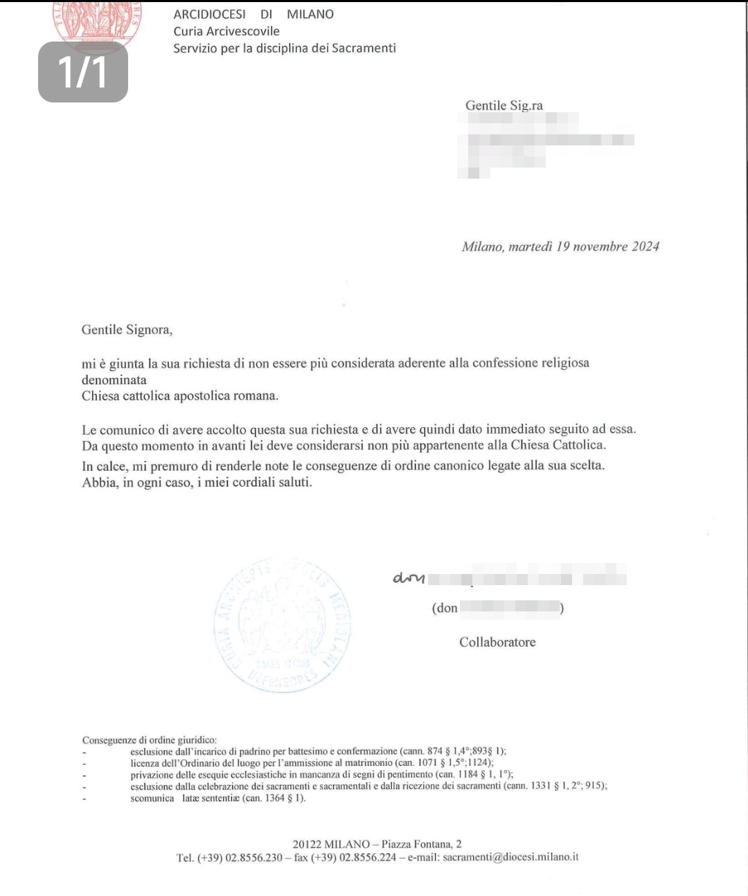Una persona ha chiesto la rettifica dei dati relativi al proprio battesimo avvenuto a S. Tecla nel Duomo di Milano - MILANO (MI) il 19/11/2024, dichiarando di non voler più far parte della Chiesa Cattolica.