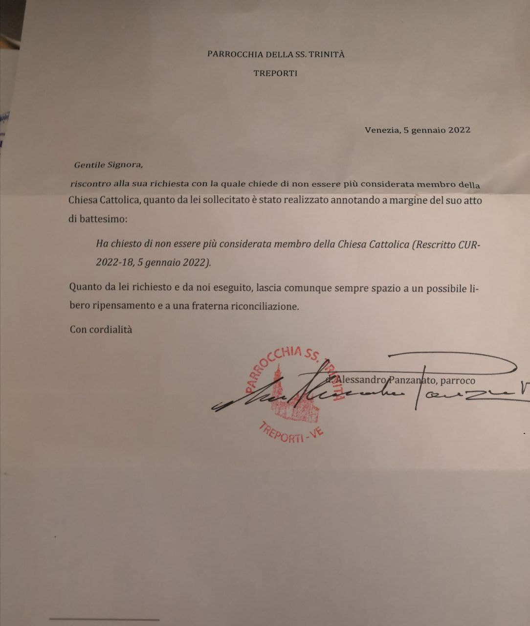 Una persona ha chiesto la rettifica dei dati relativi al proprio battesimo avvenuto a Ss. Trinità - CAVALLINO-TREPORTI (VE) il 05/01/2022, dichiarando di non voler più far parte della Chiesa Cattolica.