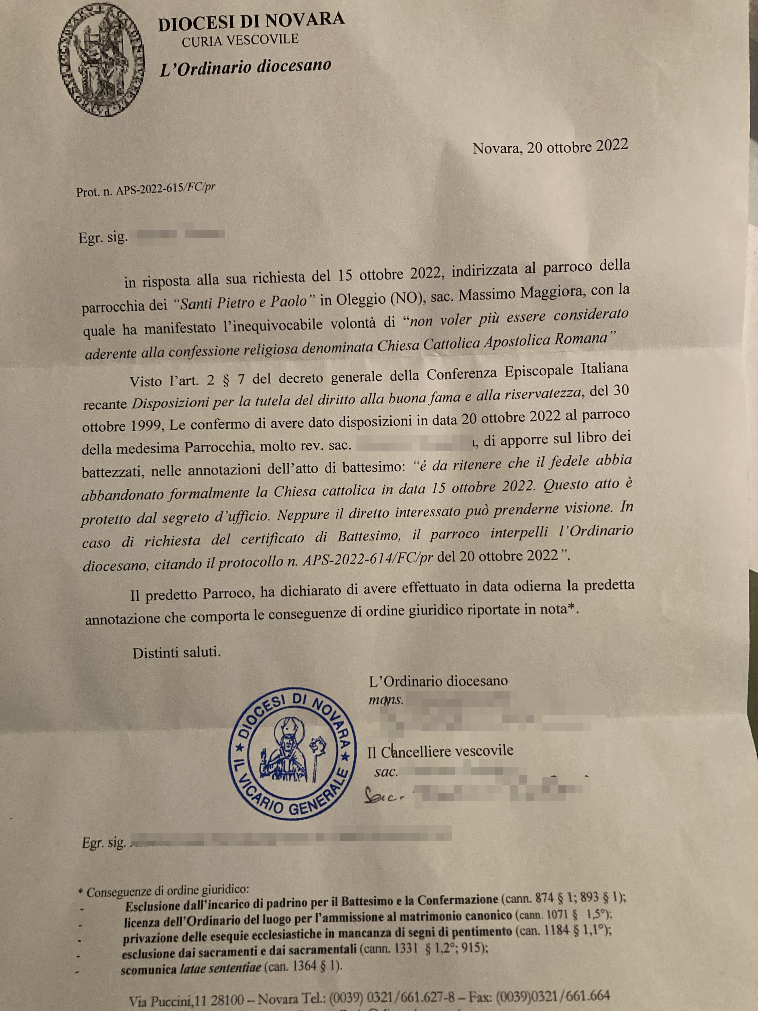 Una persona ha chiesto la rettifica dei dati relativi al proprio battesimo avvenuto a Santi Pietro e Paolo - OLEGGIO (NO) il 27/10/2022, dichiarando di non voler più far parte della Chiesa Cattolica.
