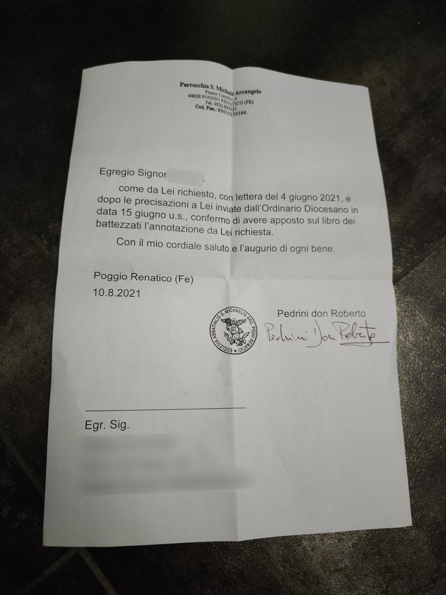 Una persona ha chiesto la rettifica dei dati relativi al proprio battesimo avvenuto a S. Michele Arcangelo di Poggio Renatico - POGGIO RENATICO (FE) il 10/08/2021, dichiarando di non voler più far parte della Chiesa Cattolica.