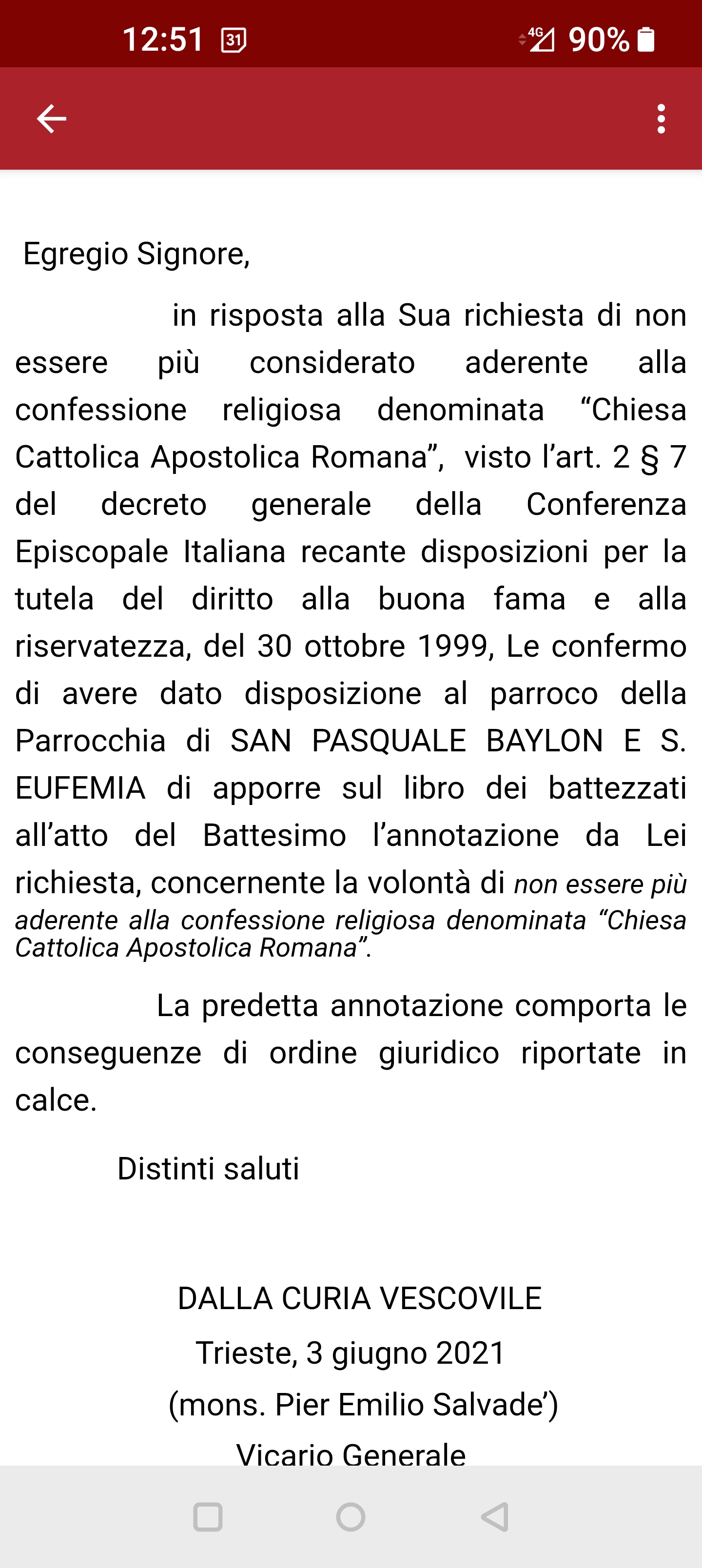 Una persona ha chiesto la rettifica dei dati relativi al proprio battesimo avvenuto a S. Pasquale Baylon e S. Eufemia - TRIESTE (TS) il 03/06/2021, dichiarando di non voler più far parte della Chiesa Cattolica.