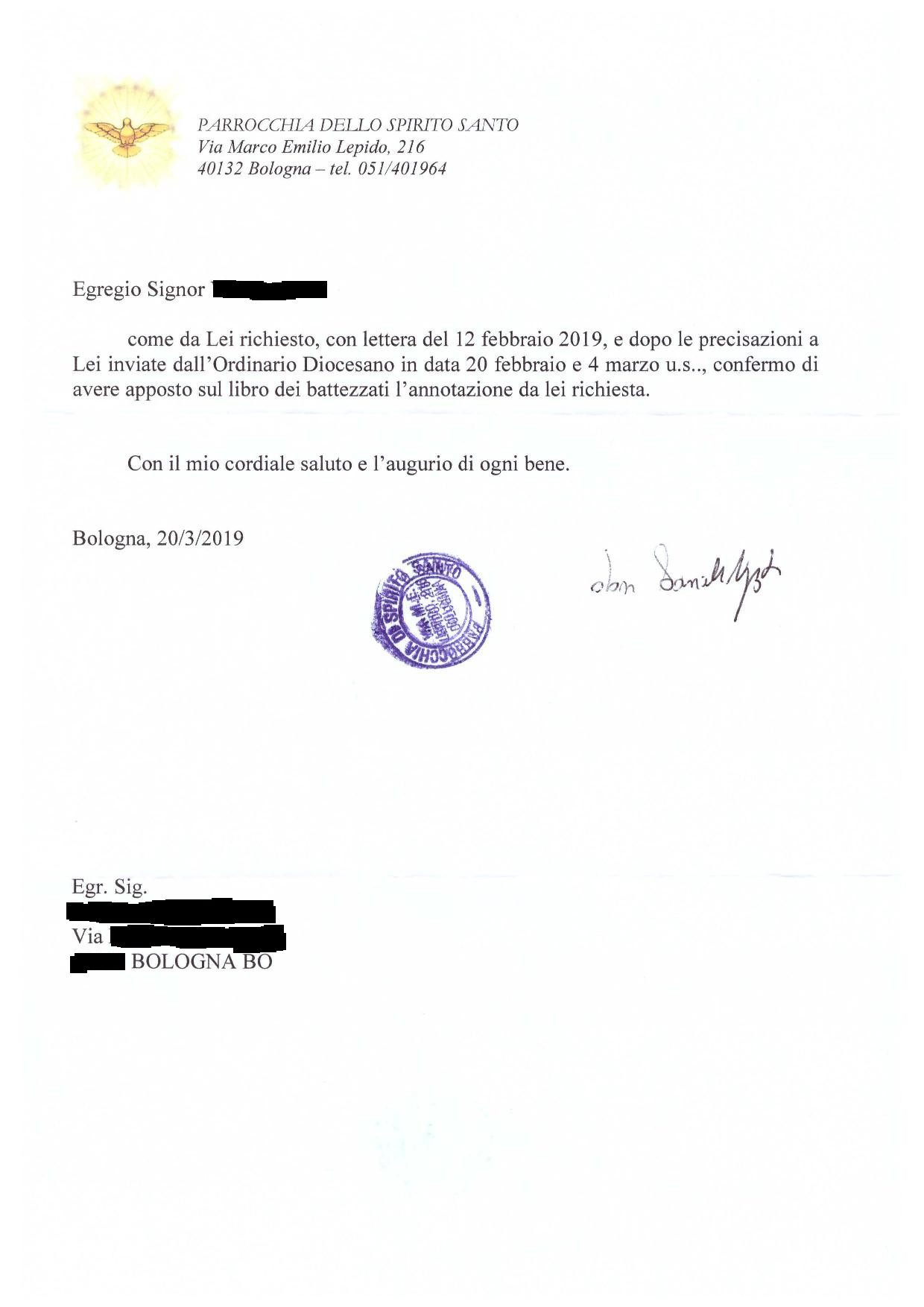 Una persona ha chiesto la rettifica dei dati relativi al proprio battesimo avvenuto a Spirito Santo - BOLOGNA (BO) il 20/03/2019, dichiarando di non voler più far parte della Chiesa Cattolica.