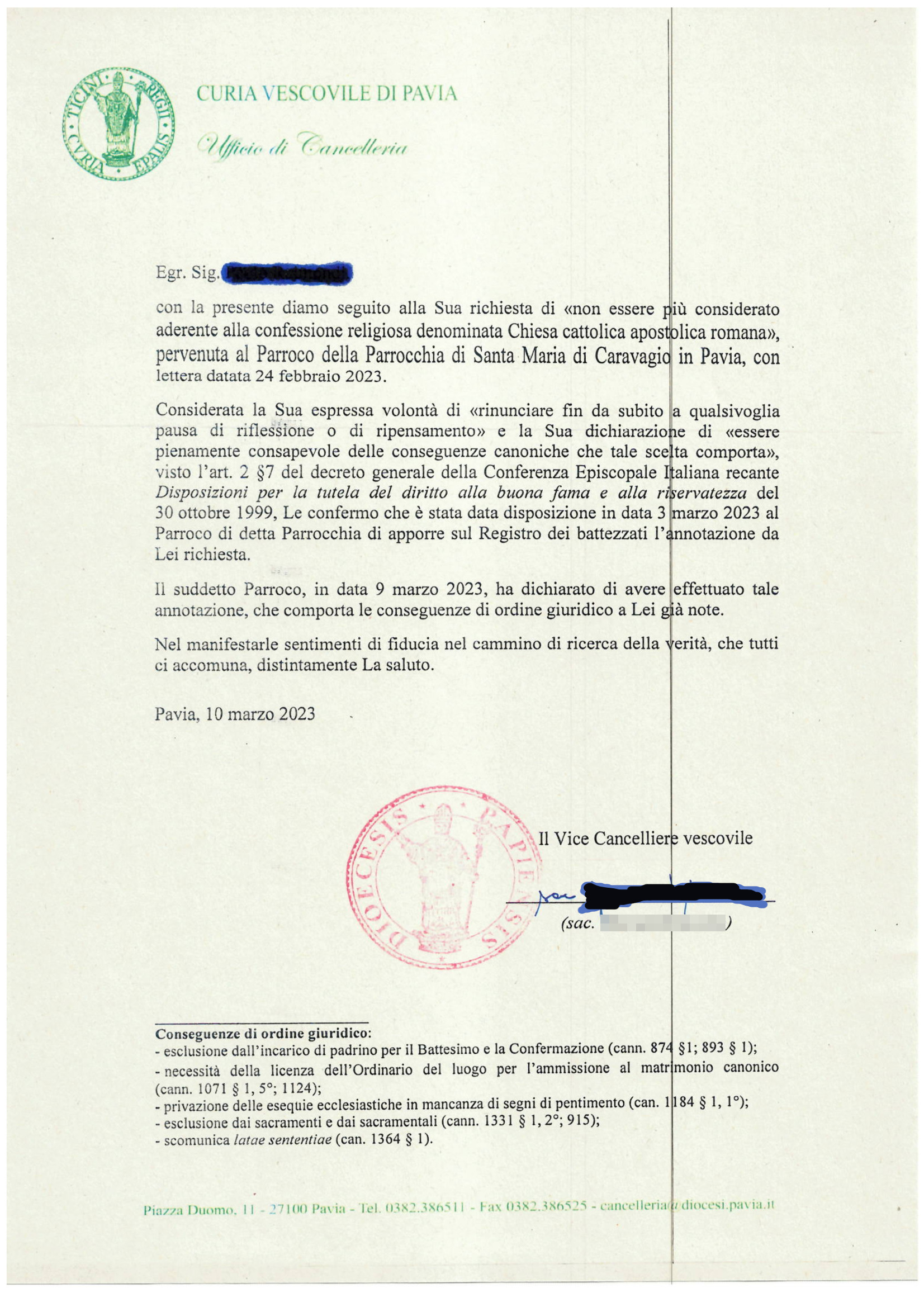 Ho inviato mail PEC alla Diocesi di Pavia, mettendo in indirizzo anche l'indirizzo della mail semplice della parrocchia, allegando la lettera di richiesta, il documento d'identità ed un vecchio certificato di battesimo che era in mio possesso. Il giorno 20 marzo mi è arrivata, direttamente dalla Curia arcivescovile di Pavia la lettera di conferma in cui mi si riferisce che il parroco ha apposto l'annotazione richiesta sul registro.