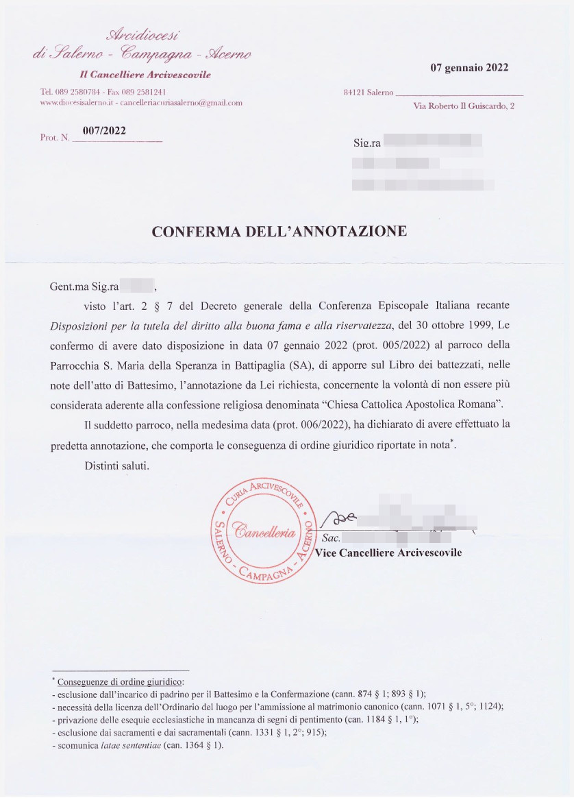 Una persona ha chiesto la rettifica dei dati relativi al proprio battesimo avvenuto a S. Maria della Speranza - BATTIPAGLIA (SA) il 01/07/2022, dichiarando di non voler più far parte della Chiesa Cattolica.
