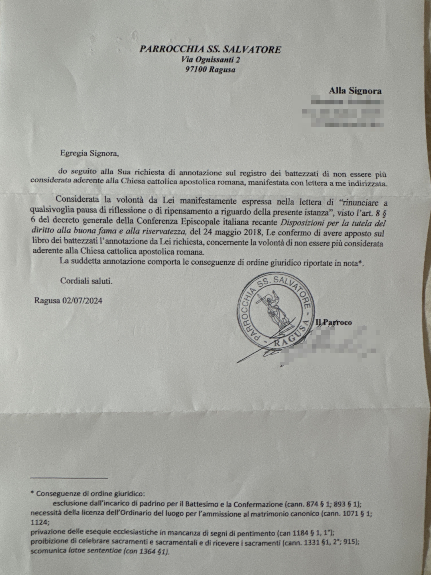 Una persona ha chiesto la rettifica dei dati relativi al proprio battesimo avvenuto a Ss. Salvatore - RAGUSA (RG) il 02/07/2024, dichiarando di non voler più far parte della Chiesa Cattolica.