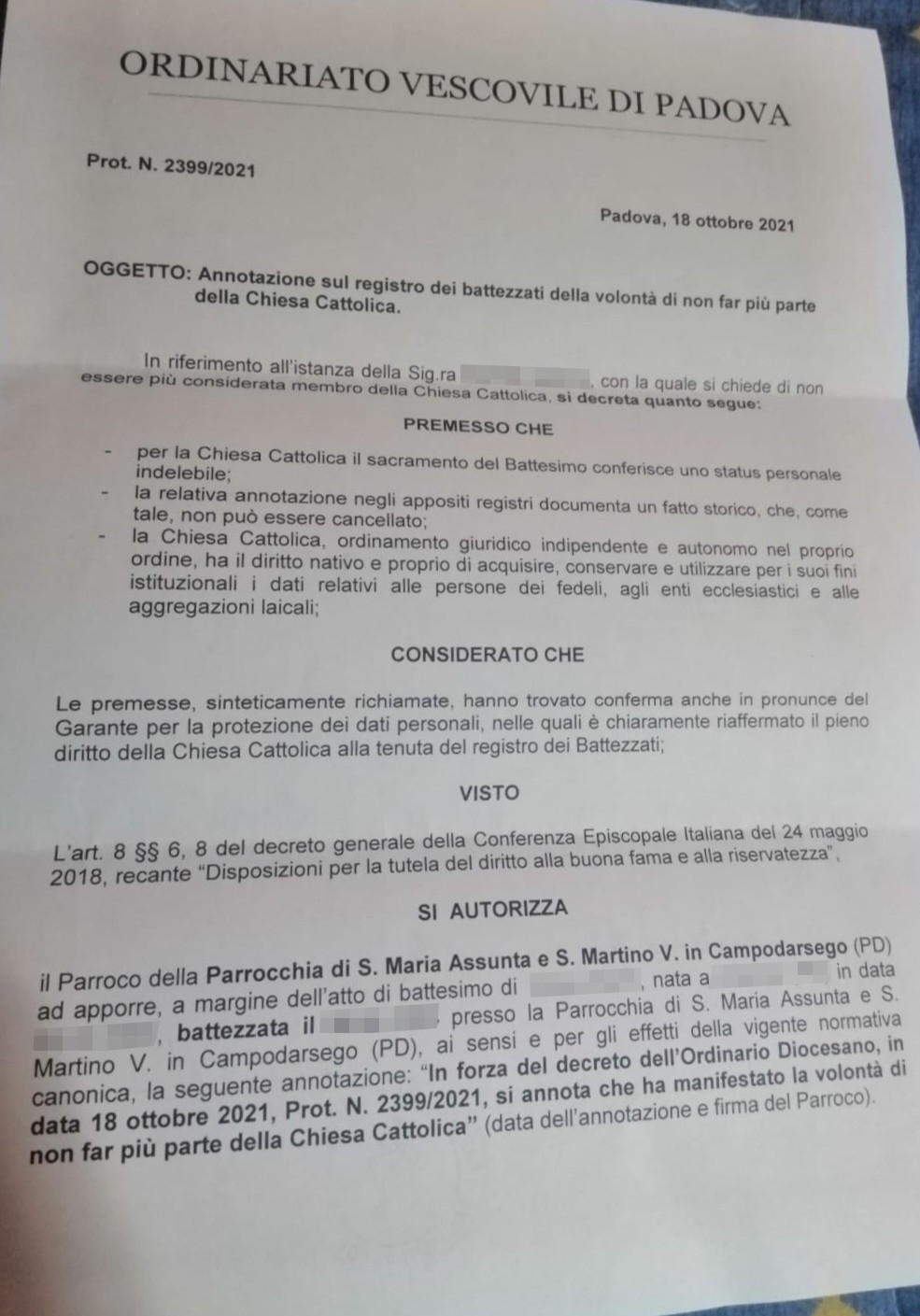 Una persona ha chiesto la rettifica dei dati relativi al proprio battesimo avvenuto a S. Daniele Martire - CAMPODARSEGO (PD) il 18/10/2021, dichiarando di non voler più far parte della Chiesa Cattolica.