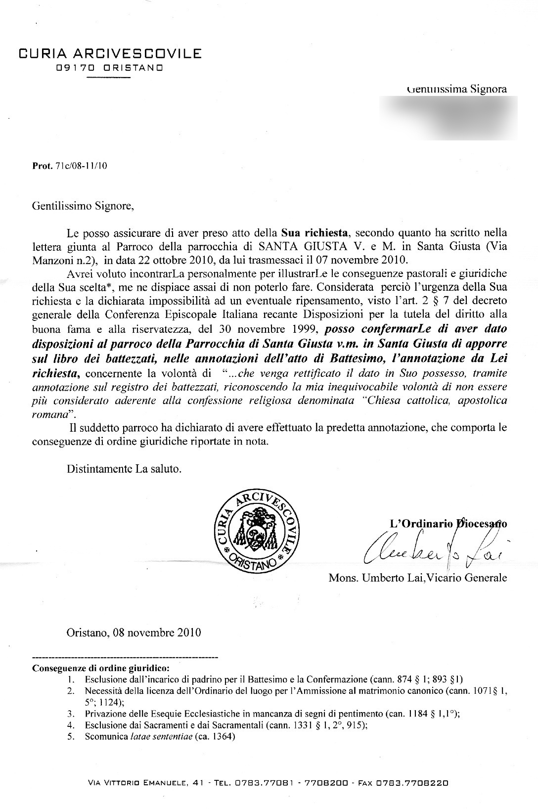 Una persona ha chiesto la rettifica dei dati relativi al proprio battesimo avvenuto a S. Giusta Vergine Martire - SANTA GIUSTA (OR) il 08/11/2010, dichiarando di non voler più far parte della Chiesa Cattolica.