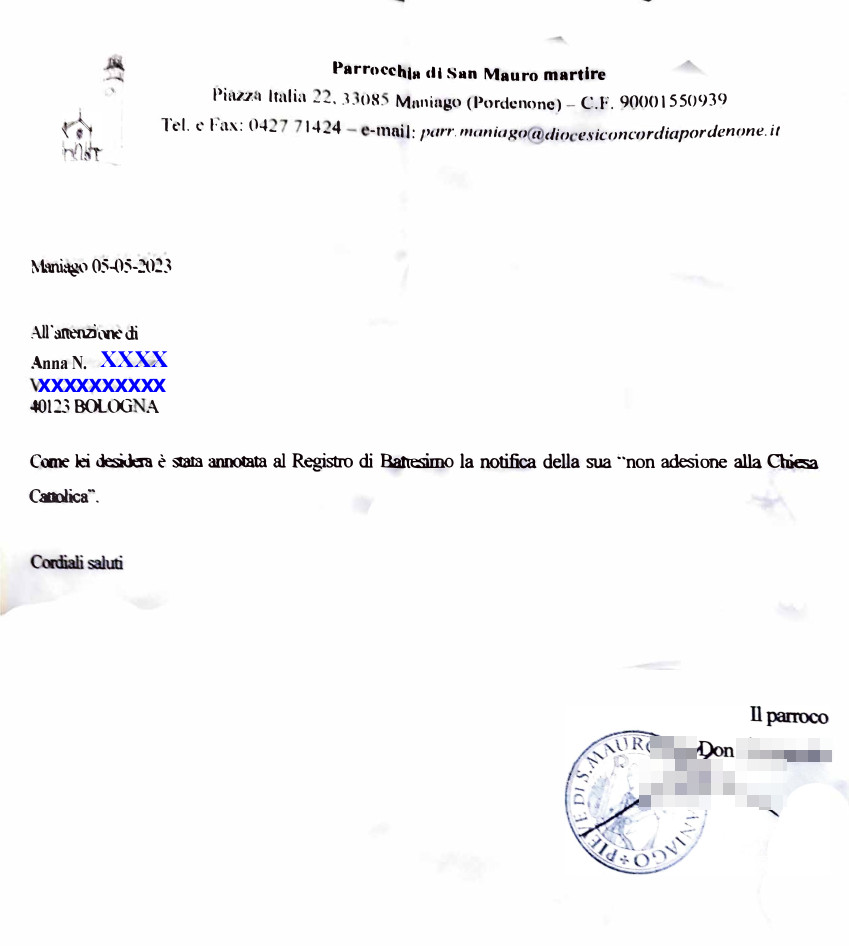 Una persona ha chiesto la rettifica dei dati relativi al proprio battesimo avvenuto a S. Mauro Martire - MANIAGO (PN) il 05/05/2023, dichiarando di non voler più far parte della Chiesa Cattolica.