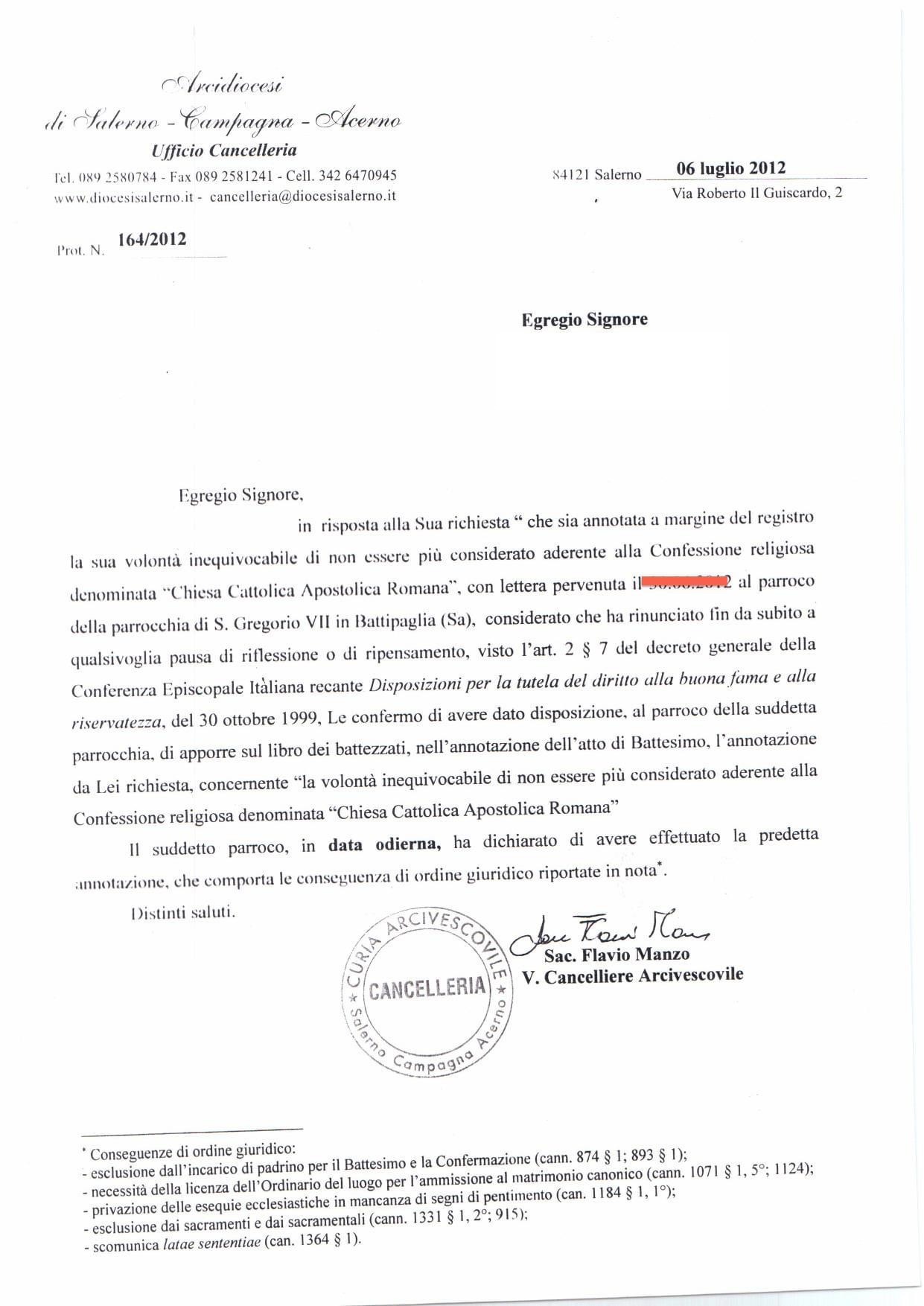 Una persona ha chiesto la rettifica dei dati relativi al proprio battesimo avvenuto a S. Gregorio VII - BATTIPAGLIA (SA) il 06/07/2012, dichiarando di non voler più far parte della Chiesa Cattolica.