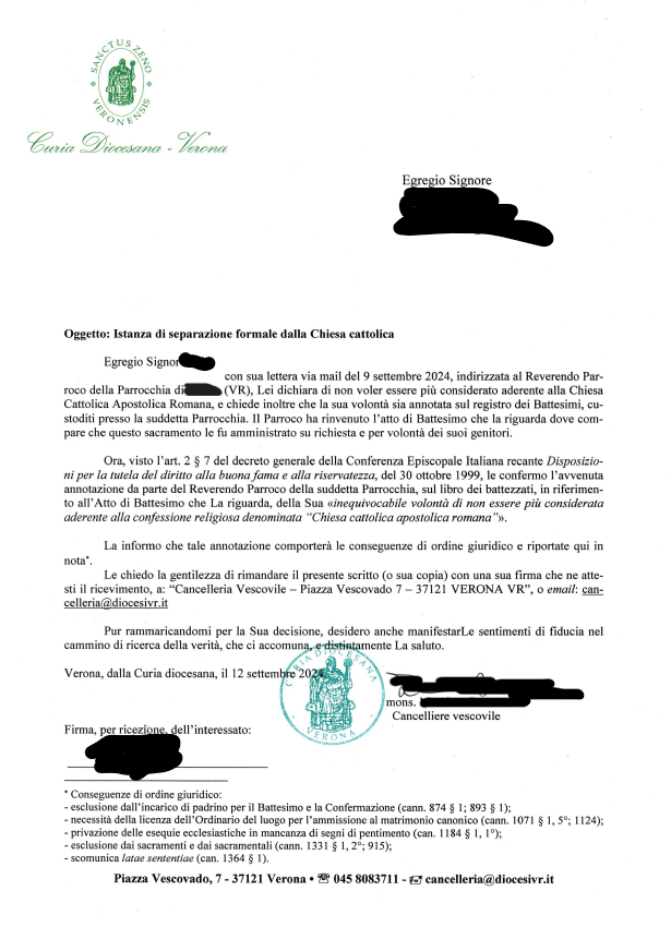 Una persona ha chiesto la rettifica dei dati relativi al proprio battesimo avvenuto a S. Gallo Abate - CAPRINO VERONESE (VR) il 12/09/2024, dichiarando di non voler più far parte della Chiesa Cattolica.