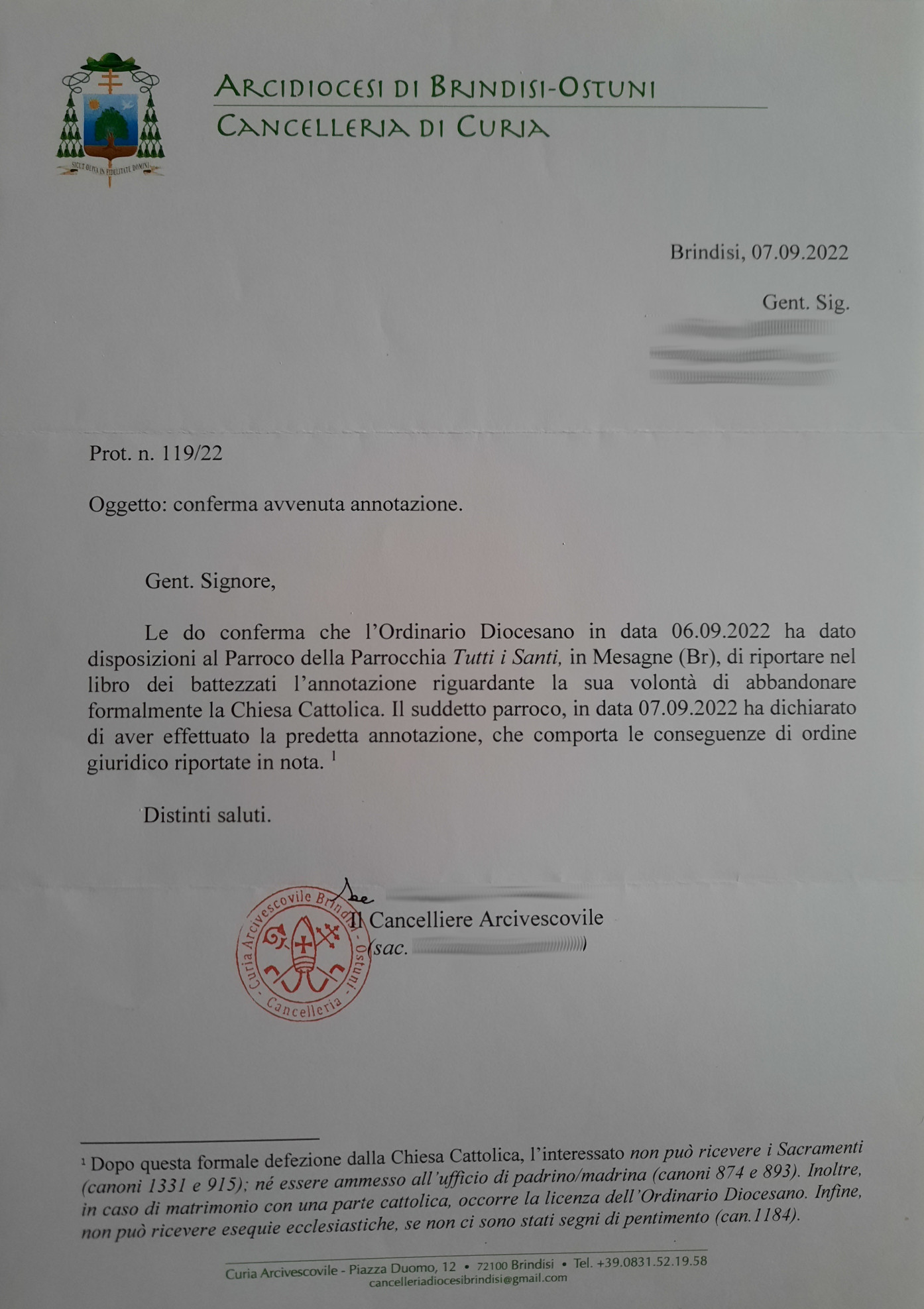 Una persona ha chiesto la rettifica dei dati relativi al proprio battesimo avvenuto a Tutti I Santi - MESAGNE (BR) il 07/09/2022, dichiarando di non voler più far parte della Chiesa Cattolica.