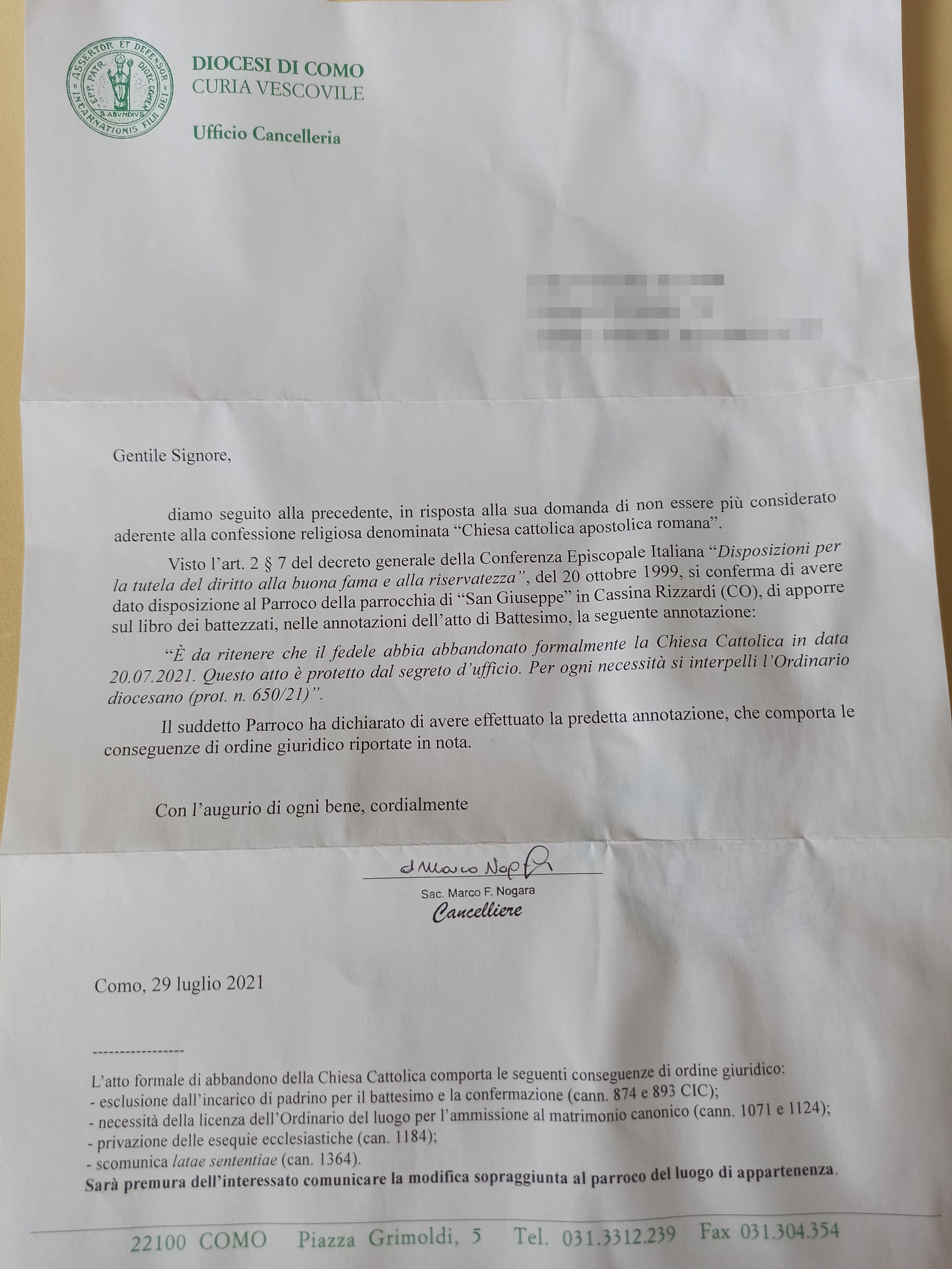 Una persona ha chiesto la rettifica dei dati relativi al proprio battesimo avvenuto a S. Giuseppe - CASSINA RIZZARDI (CO) il 29/07/2021, dichiarando di non voler più far parte della Chiesa Cattolica.
