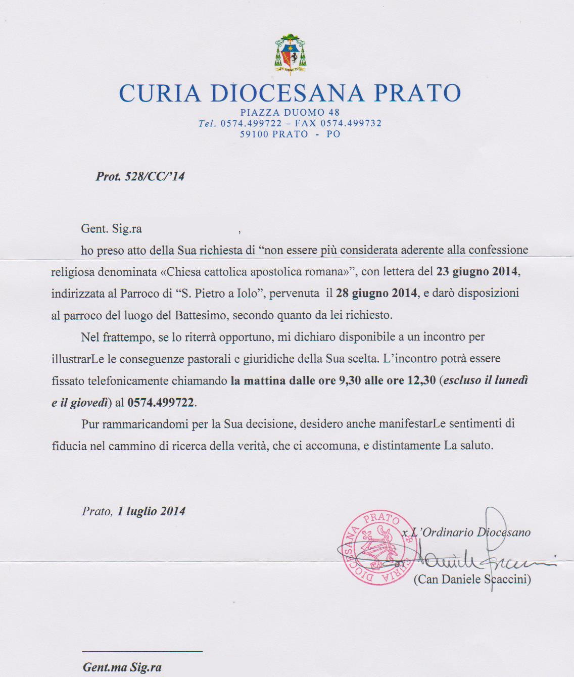 Una persona ha chiesto la rettifica dei dati relativi al proprio battesimo avvenuto a San Pietro a Iolo - PRATO (PO) il 01/07/2014, dichiarando di non voler più far parte della Chiesa Cattolica.