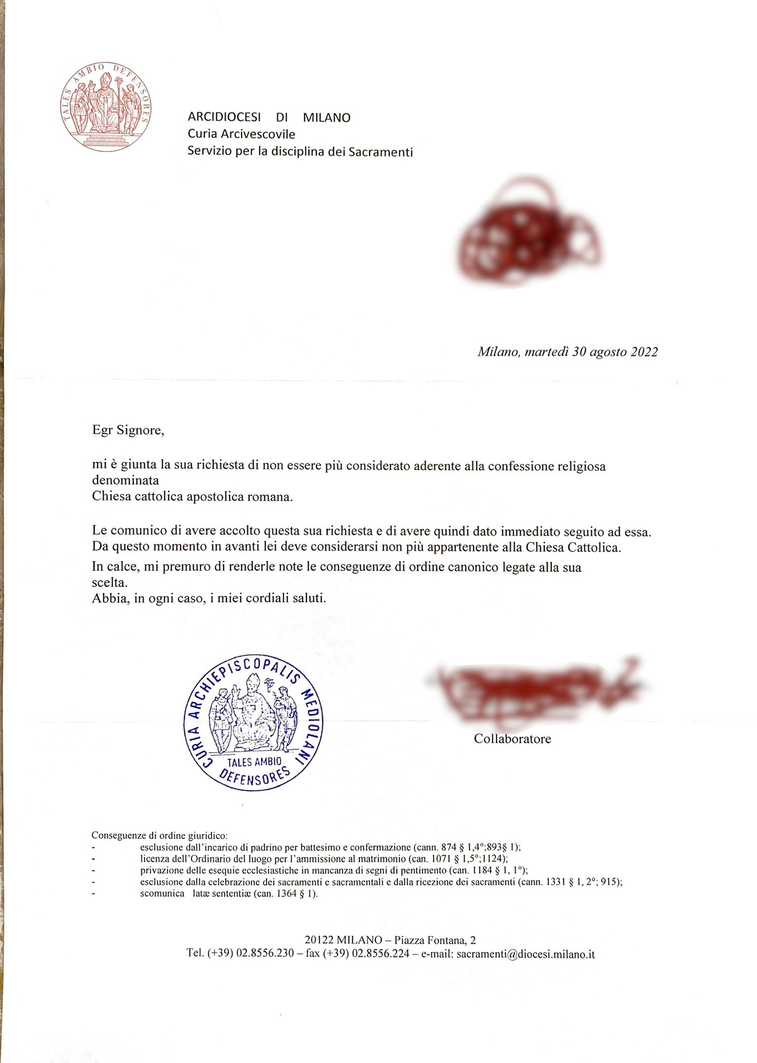Una persona ha chiesto la rettifica dei dati relativi al proprio battesimo avvenuto a S. Maria Assunta in Turro - MILANO (MI) il 30/08/2022, dichiarando di non voler più far parte della Chiesa Cattolica.