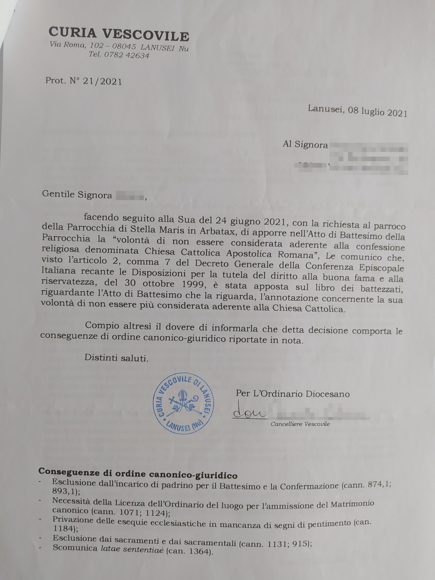 Una persona ha chiesto la rettifica dei dati relativi al proprio battesimo avvenuto a Madonna Stella Maris - TORTOLÌ (NU) il 08/07/2021, dichiarando di non voler più far parte della Chiesa Cattolica.
